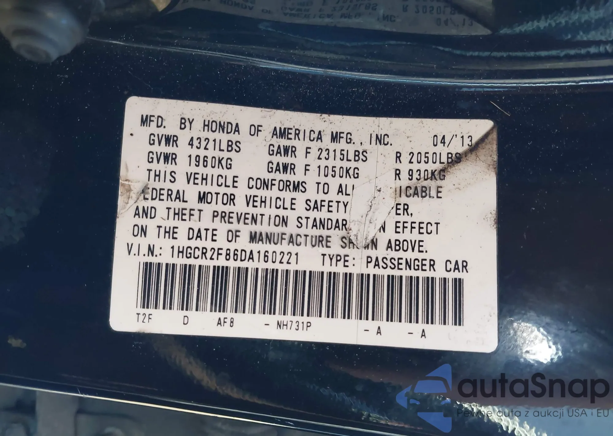 • VIN 1HGCR2F86DA160221