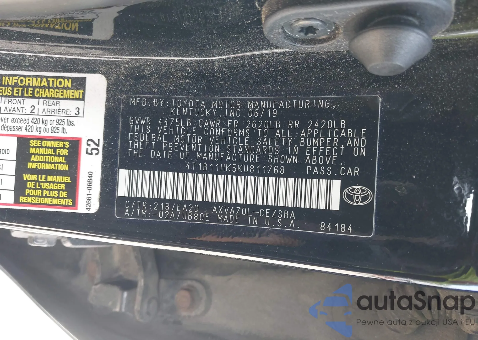 LOT: 42050504 VIN: 4T1B11HK5KU811768