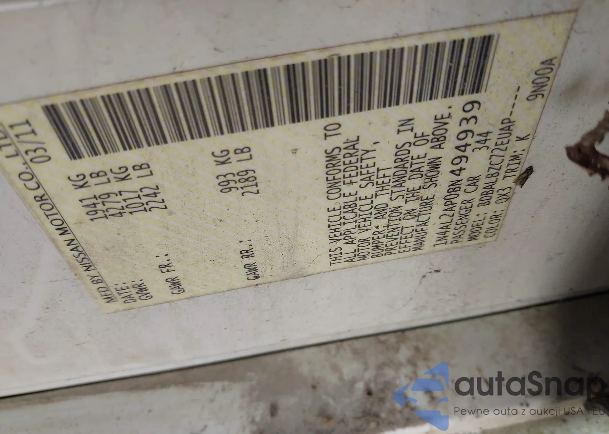 LOT: 42050377 VIN: 1N4AL2AP0BN494939