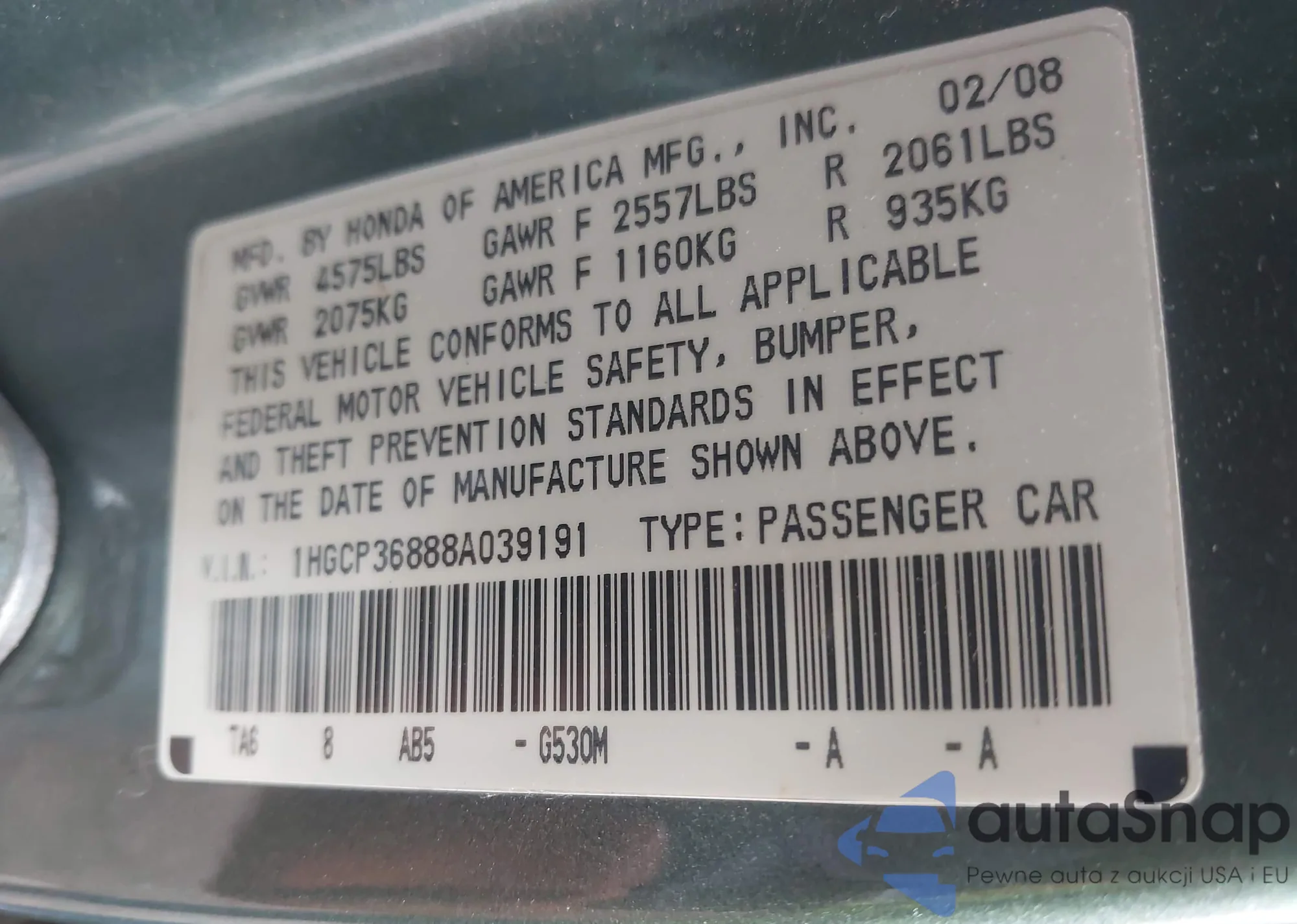 LOT: 42088704 VIN: 1HGCP36888A039191