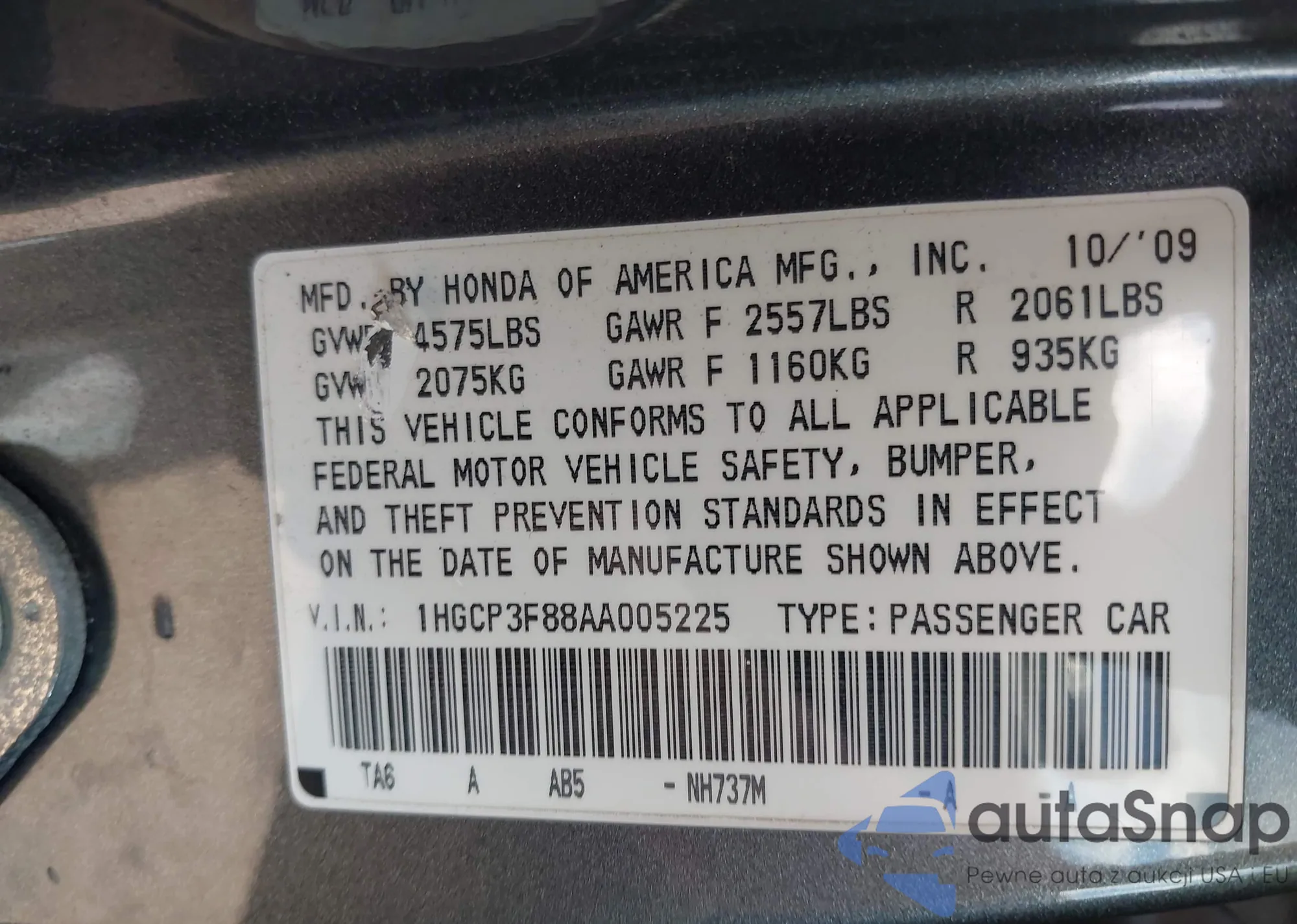 LOT: 42217473 VIN: 1HGCP3F88AA005225
