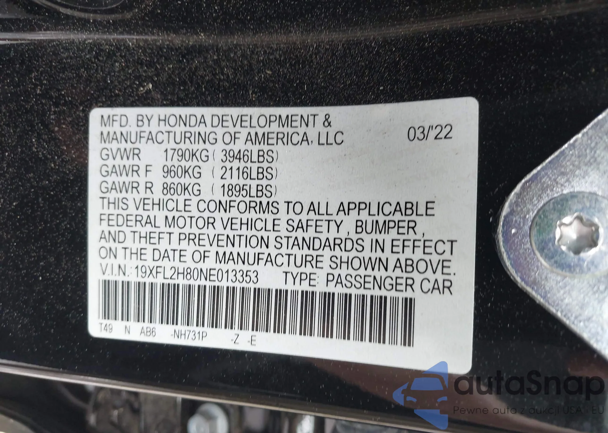LOT: 42102251 VIN: 19XFL2H80NE013353