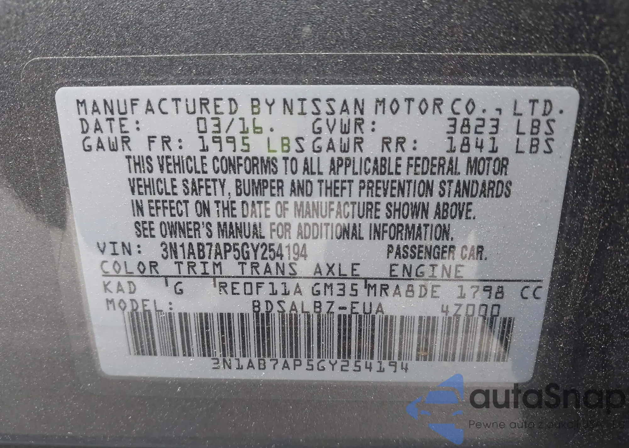 LOT: 42120010 VIN: 3N1AB7AP5GY254194