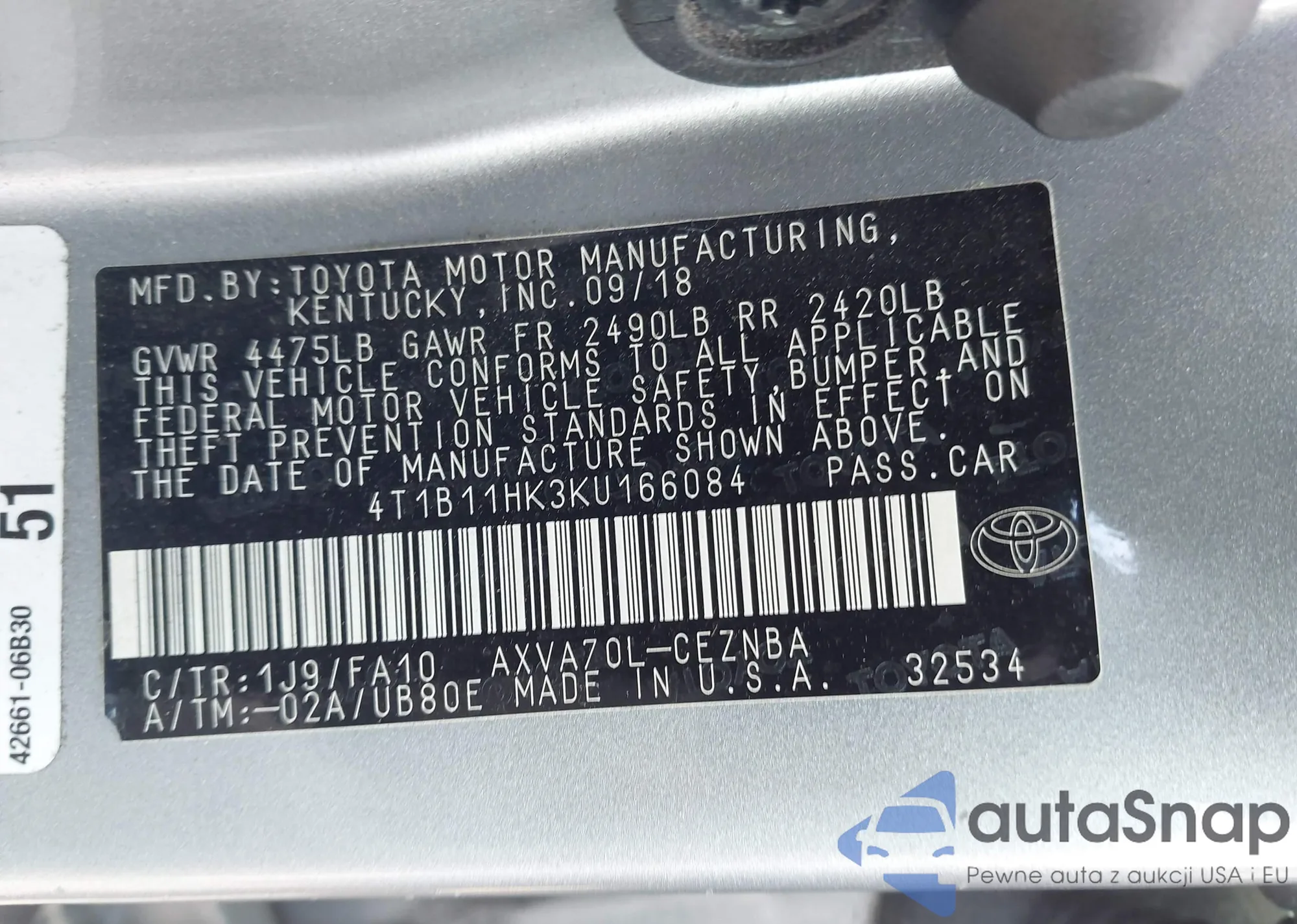 LOT: 42120285 VIN: 4T1B11HK3KU166084