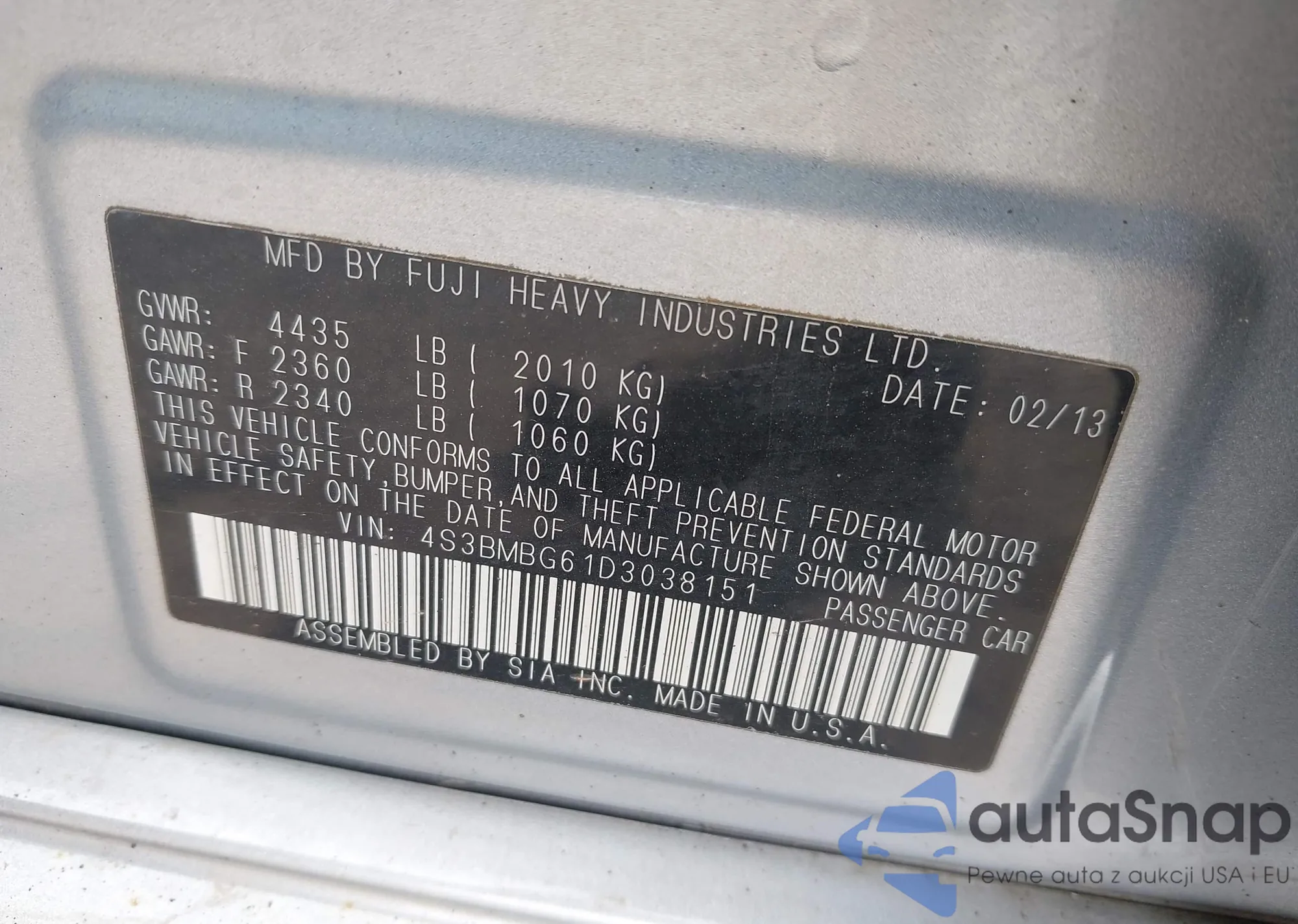 LOT: 42130551 VIN: 4S3BMBG61D3038151