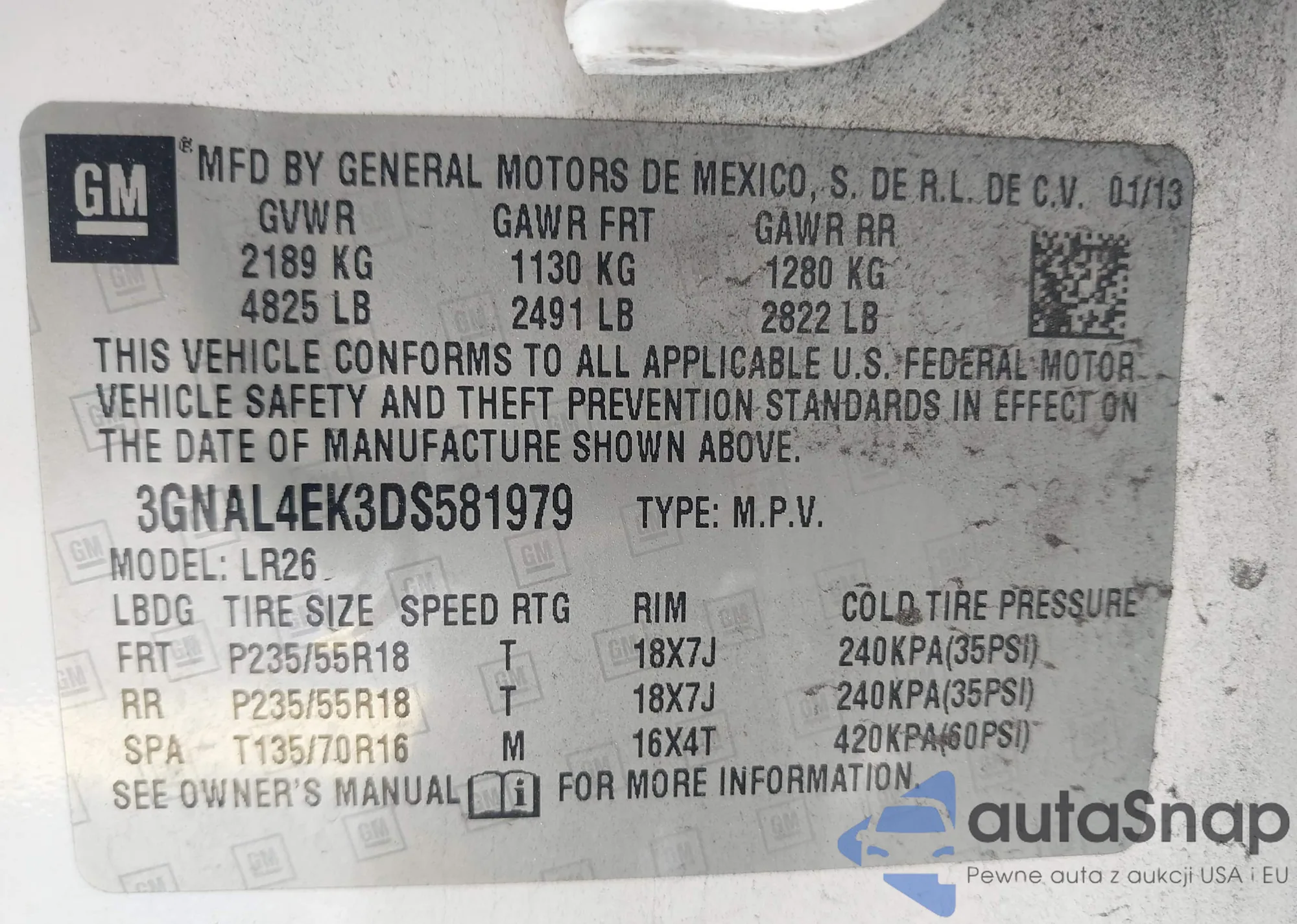 LOT: 42312792 VIN: 3GNAL4EK3DS581979