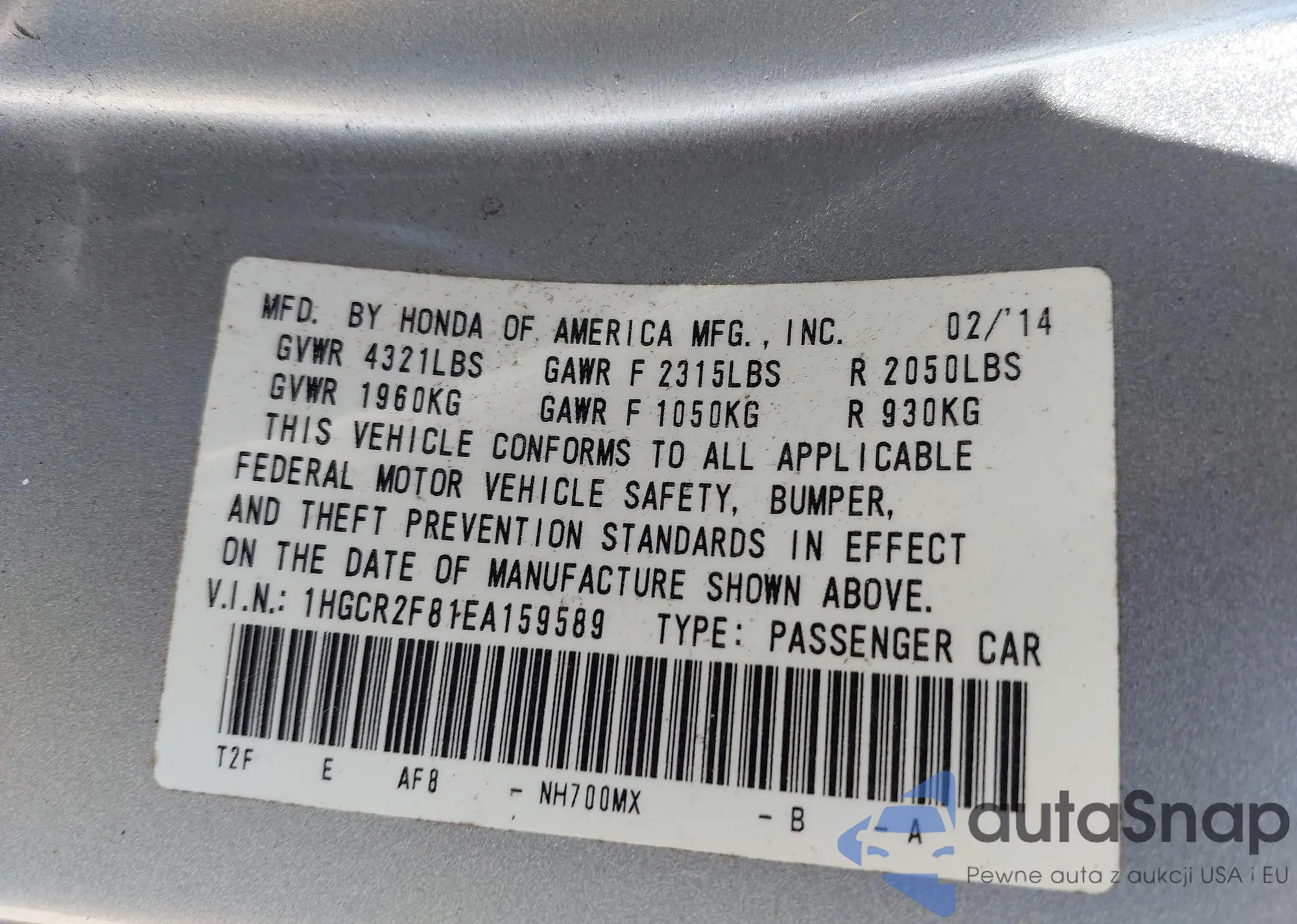 • VIN 1HGCR2F81EA159589