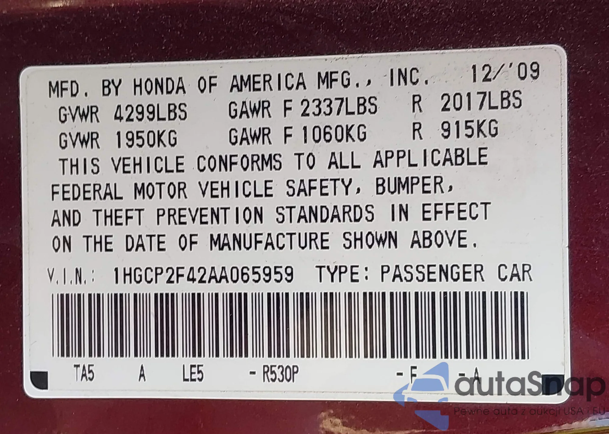 LOT: 42378793 VIN: 1HGCP2F42AA065959