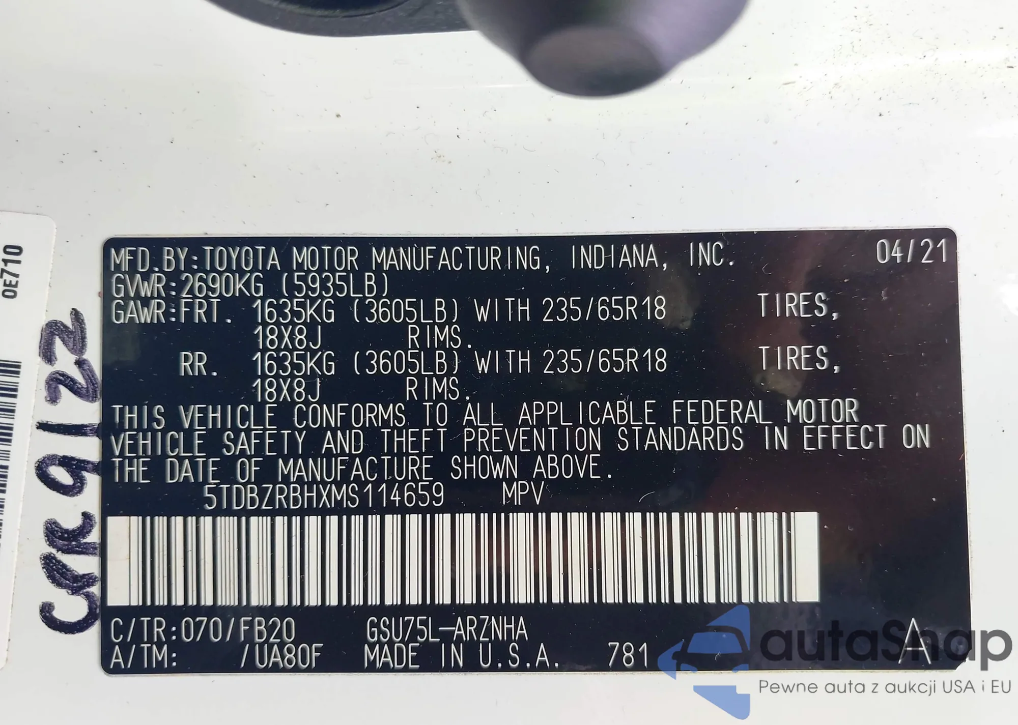 LOT: 41955011 VIN: 5TDBZRBHXMS114659