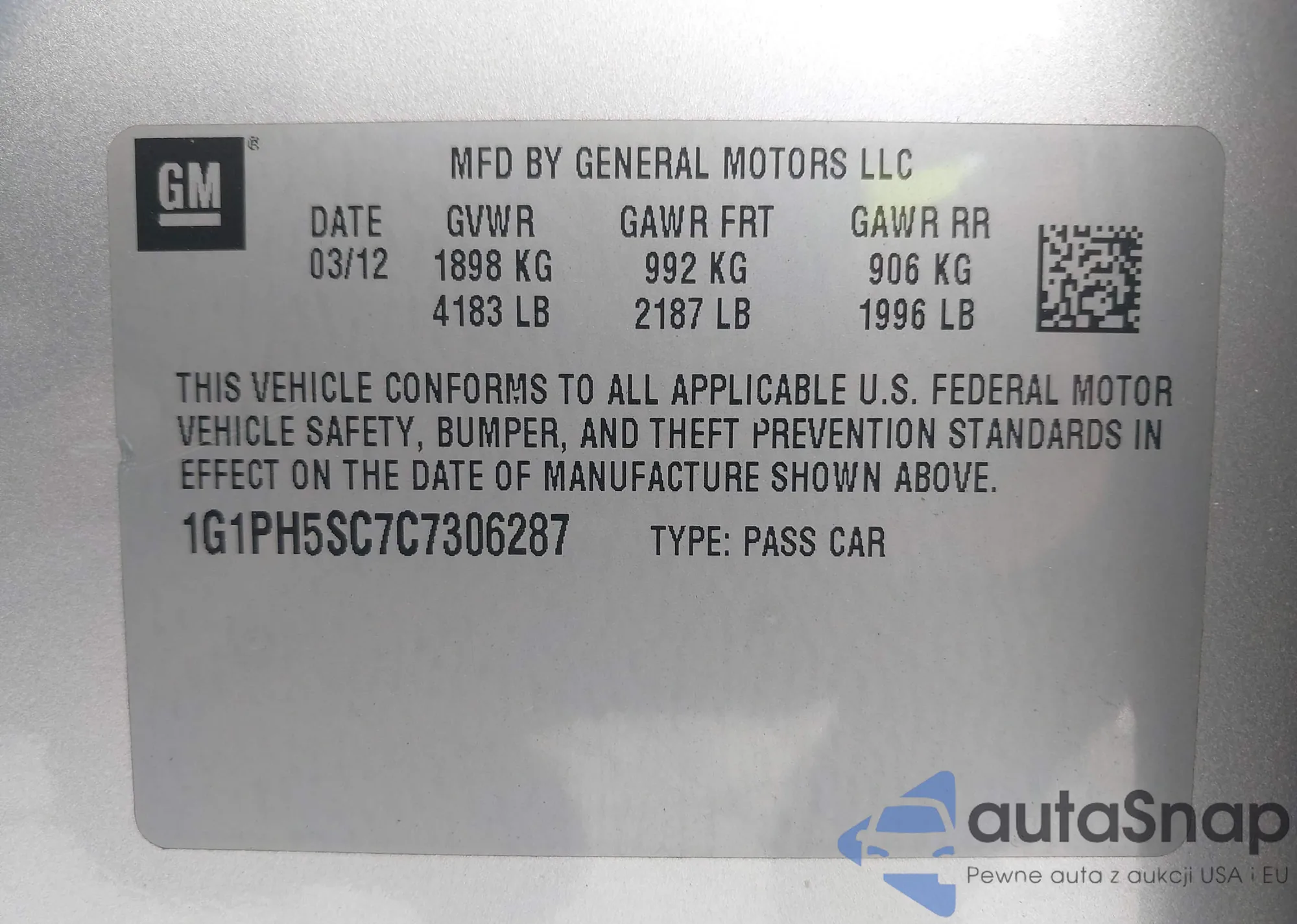 LOT: 42292277 VIN: 1G1PH5SC7C7306287