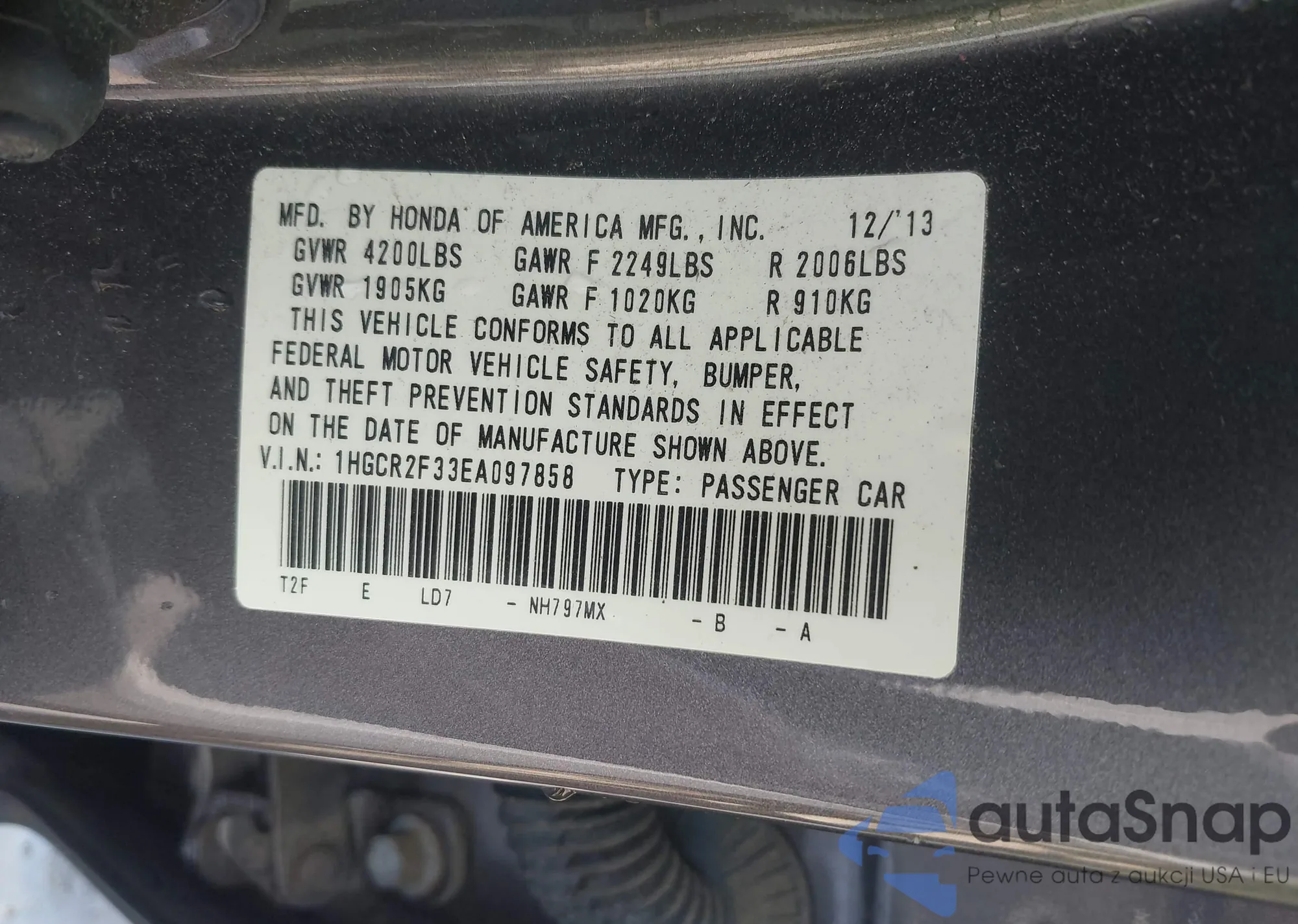 LOT: 42313751 VIN: 1HGCR2F33EA097858