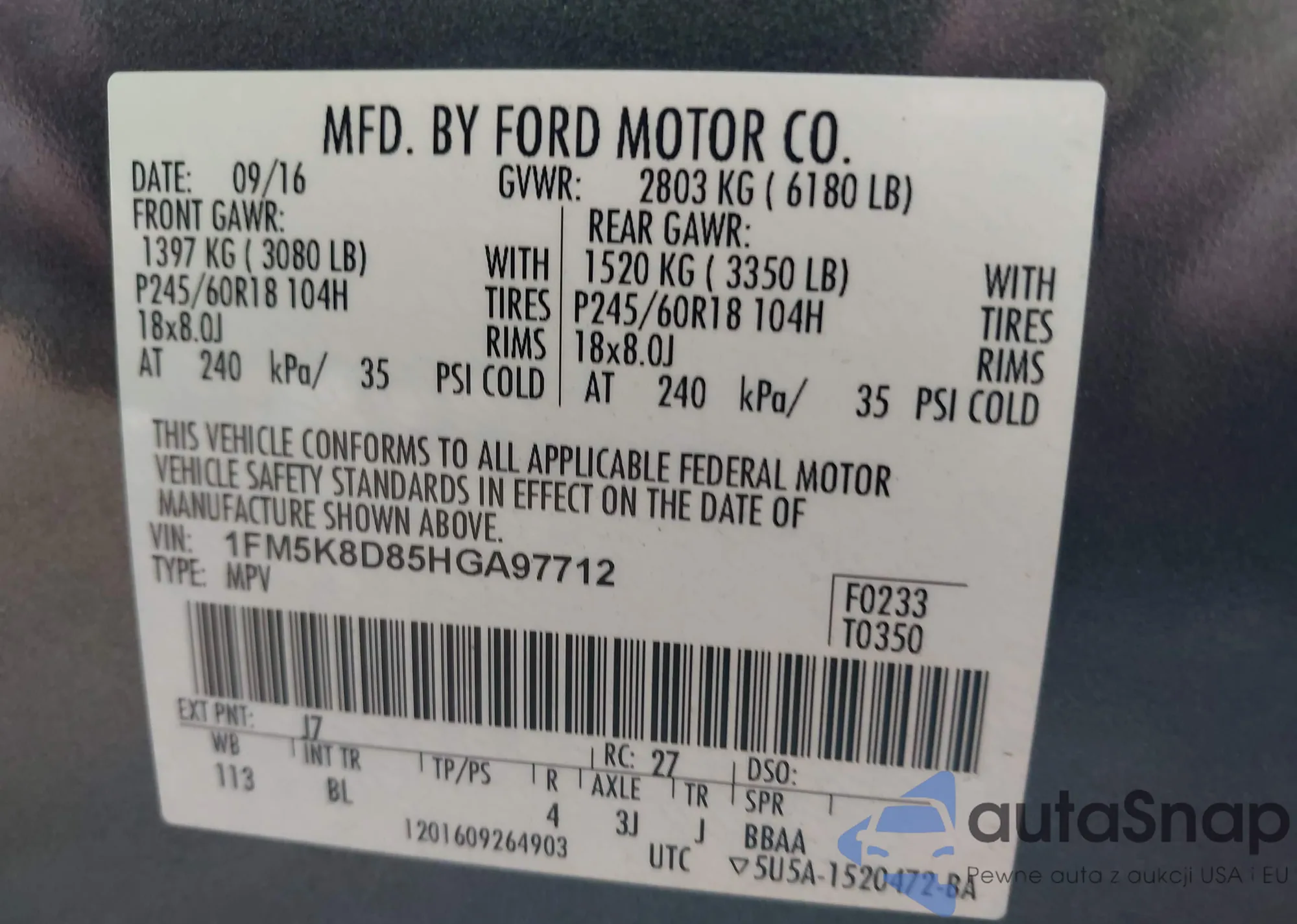 • VIN 1FM5K8D85HGA97712