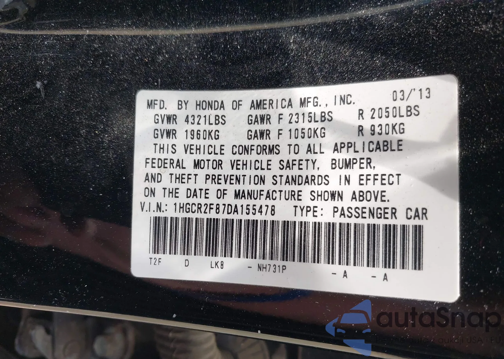 • VIN 1HGCR2F87DA155478