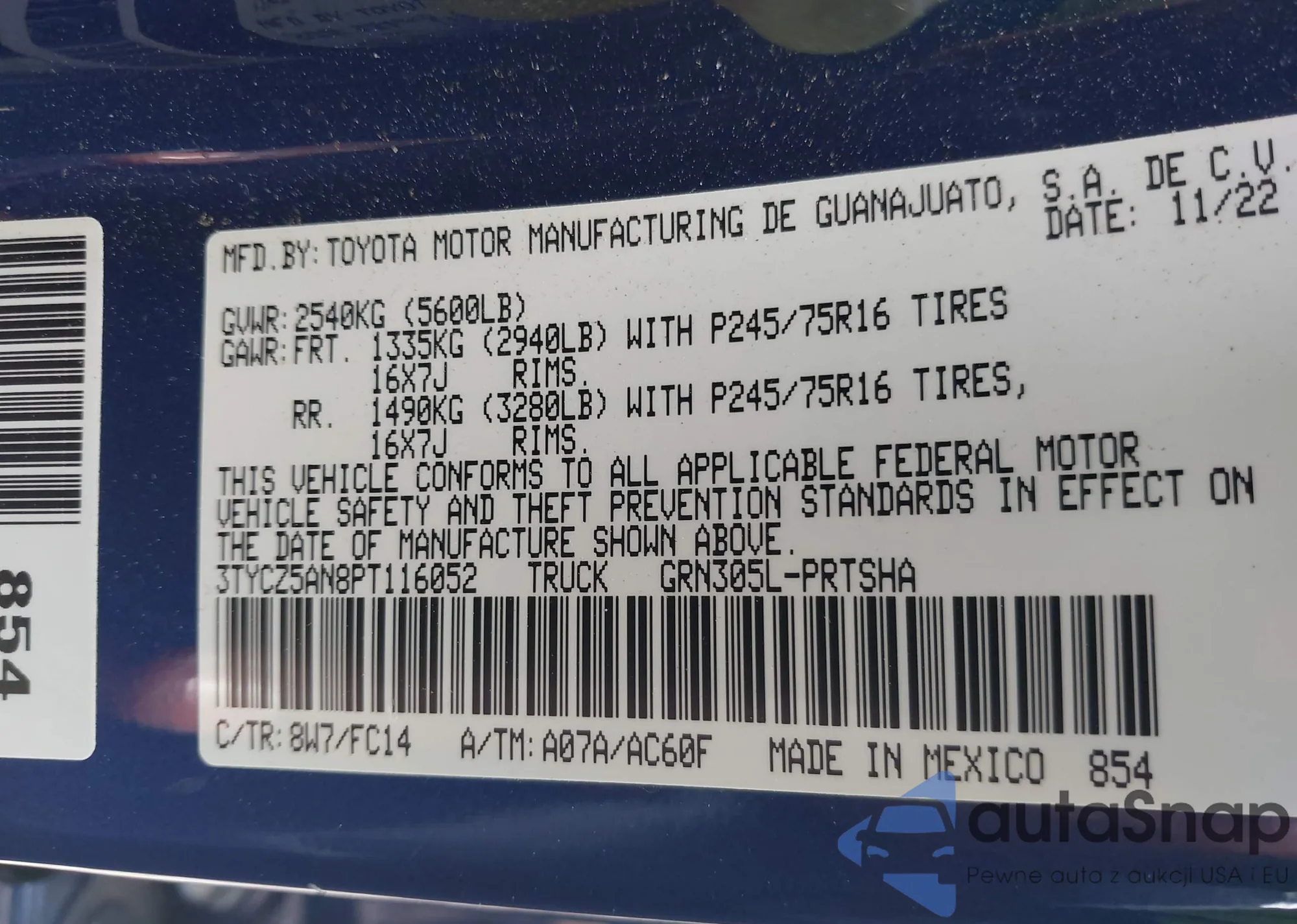 • VIN 3TYCZ5AN8PT116052