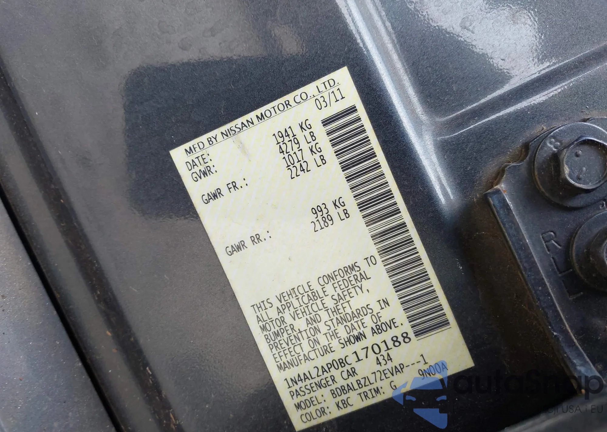 LOT: 42311356 VIN: 1N4AL2AP0BC170188