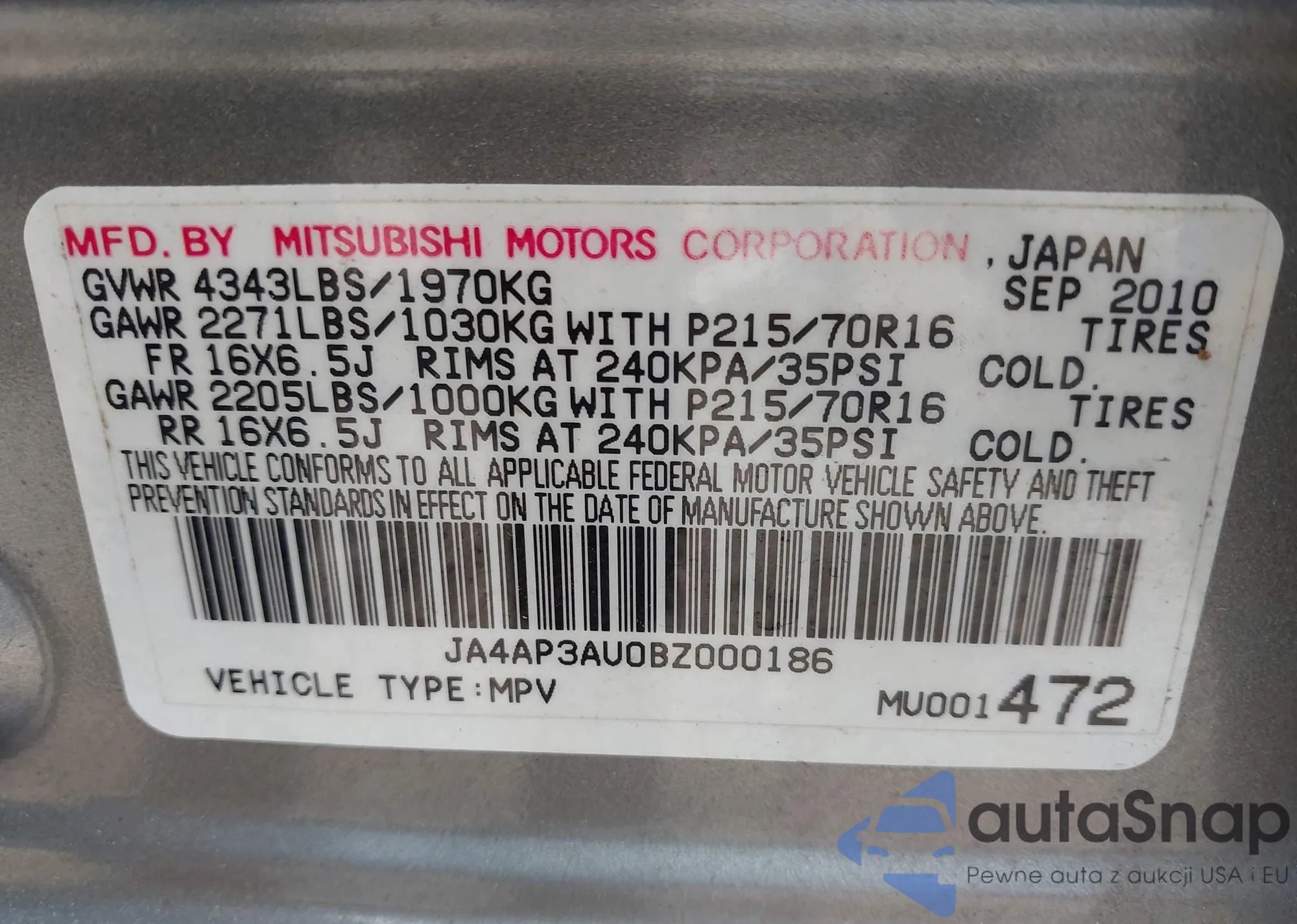 LOT: 42336262 VIN: JA4AP3AU0BZ000186