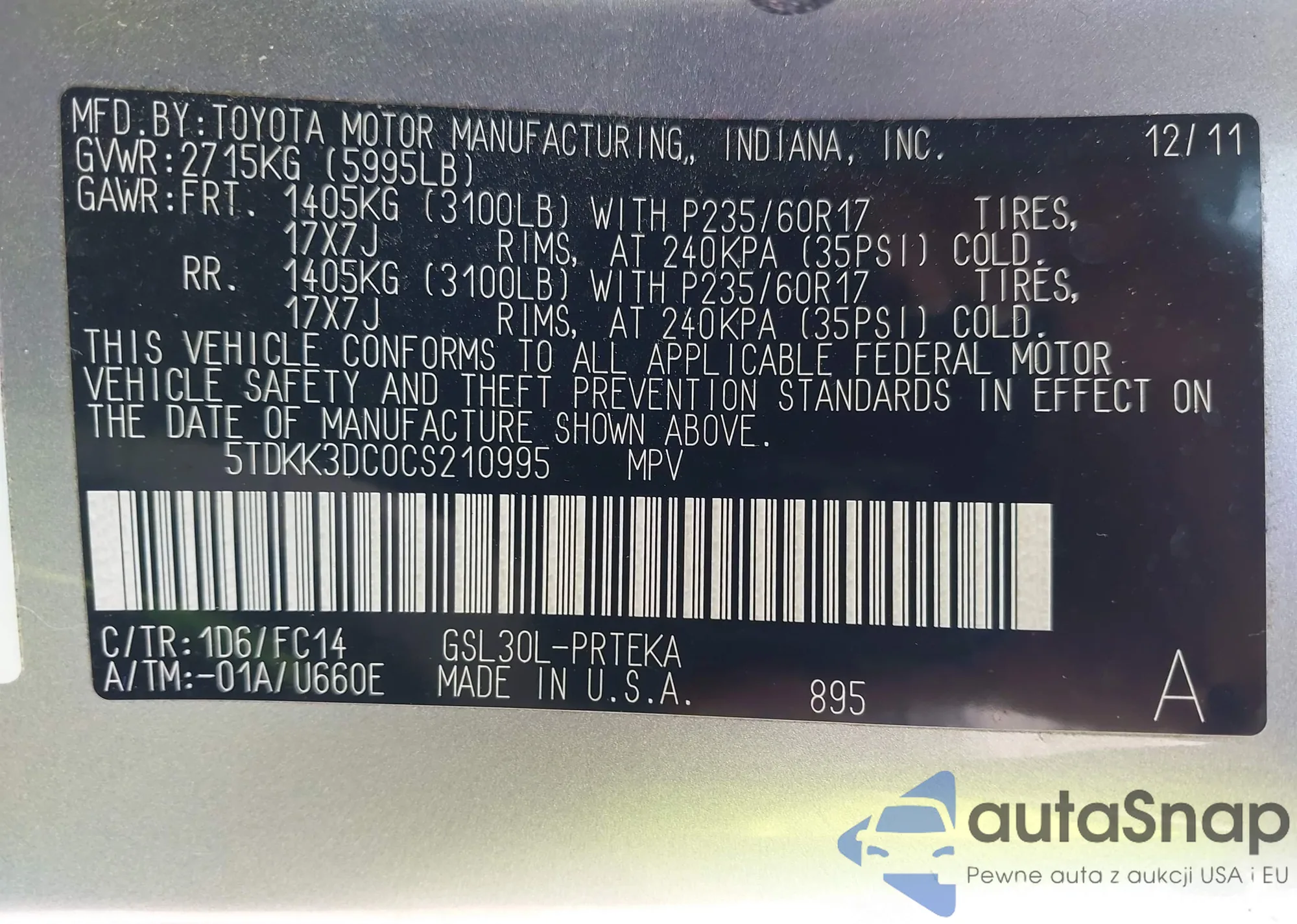 LOT: 42439317 VIN: 5TDKK3DC0CS210995