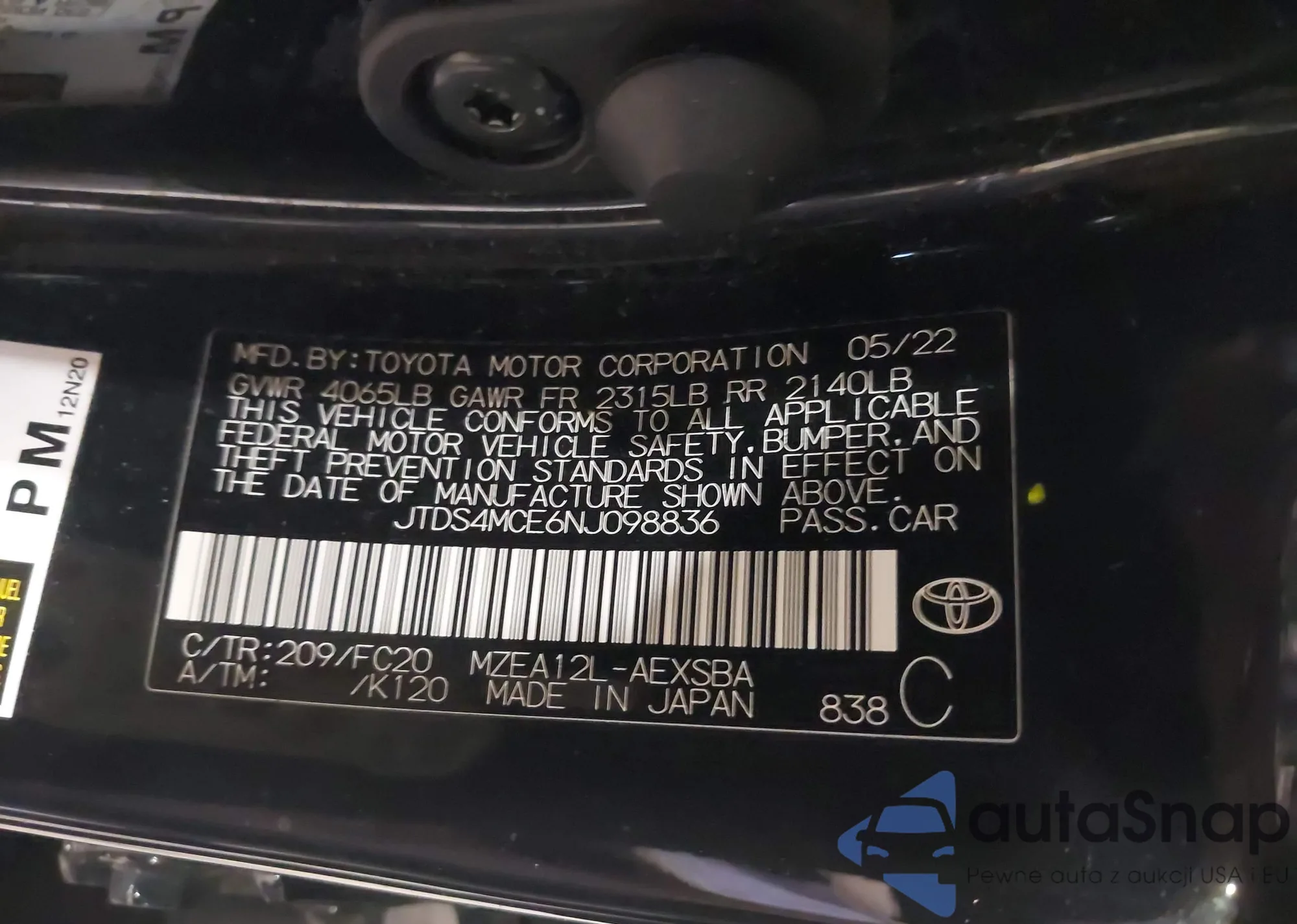 LOT: 42274247 VIN: JTDS4MCE6NJ098836