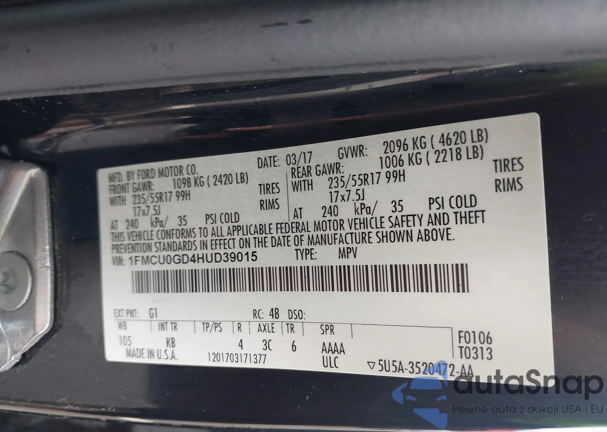 LOT: 42210631 VIN: 1FMCU0GD4HUD39015
