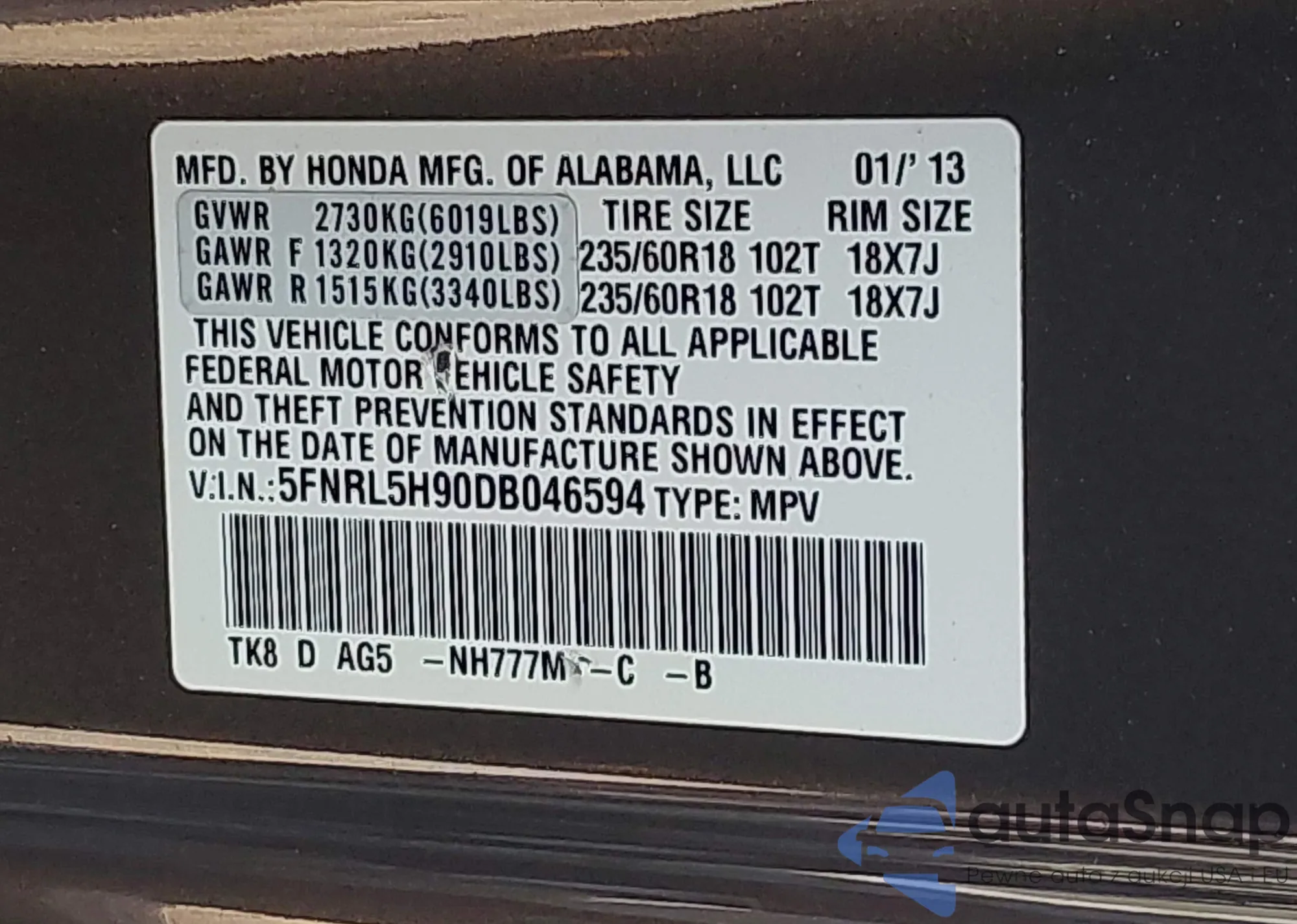 • VIN 5FNRL5H90DB046594