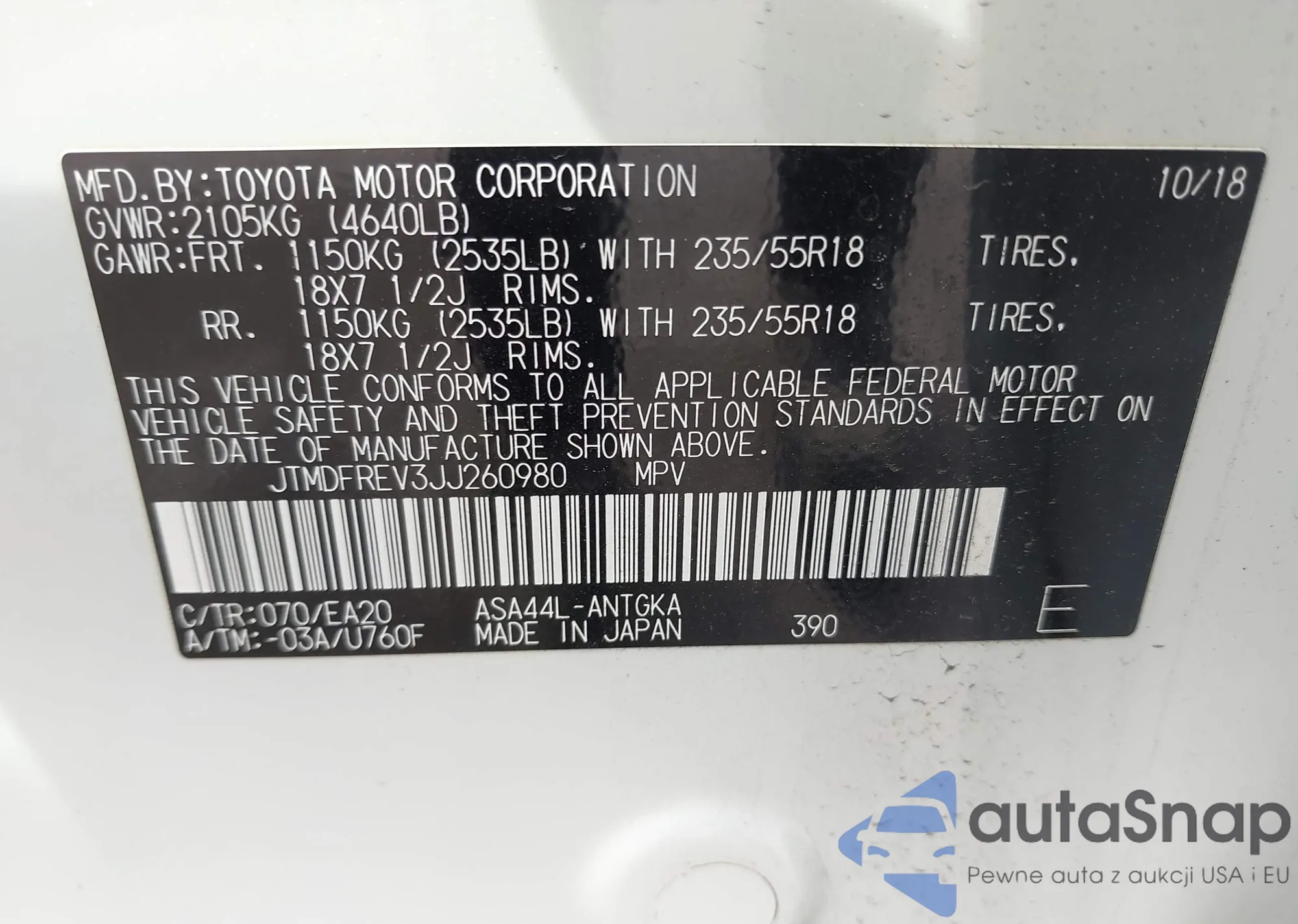 LOT: 42211465 VIN: JTMDFREV3JJ260980