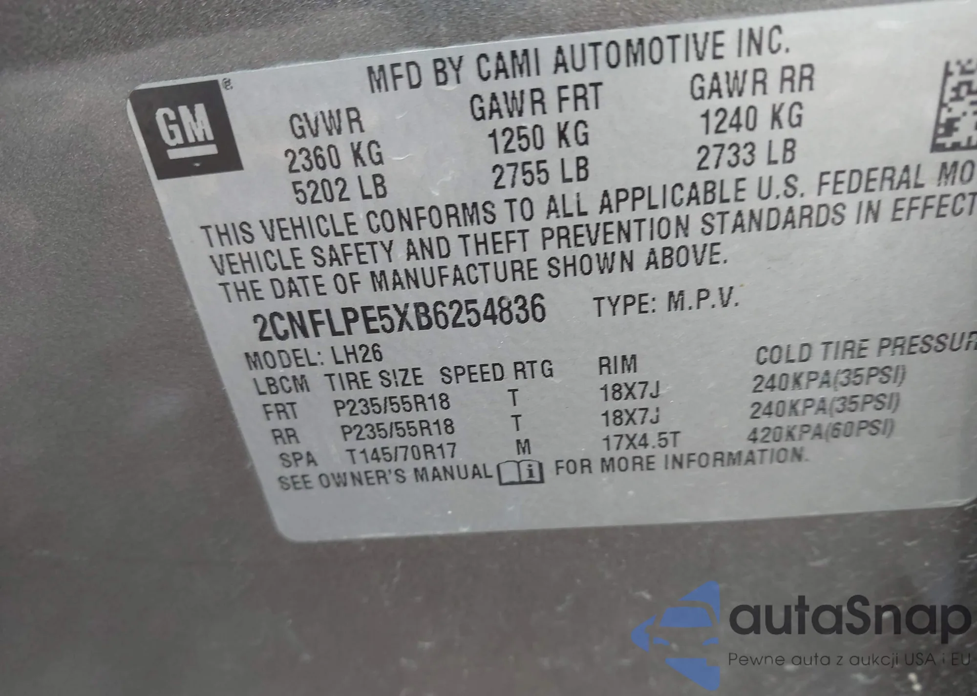 LOT: 42309825 VIN: 2CNFLPE5XB6254836