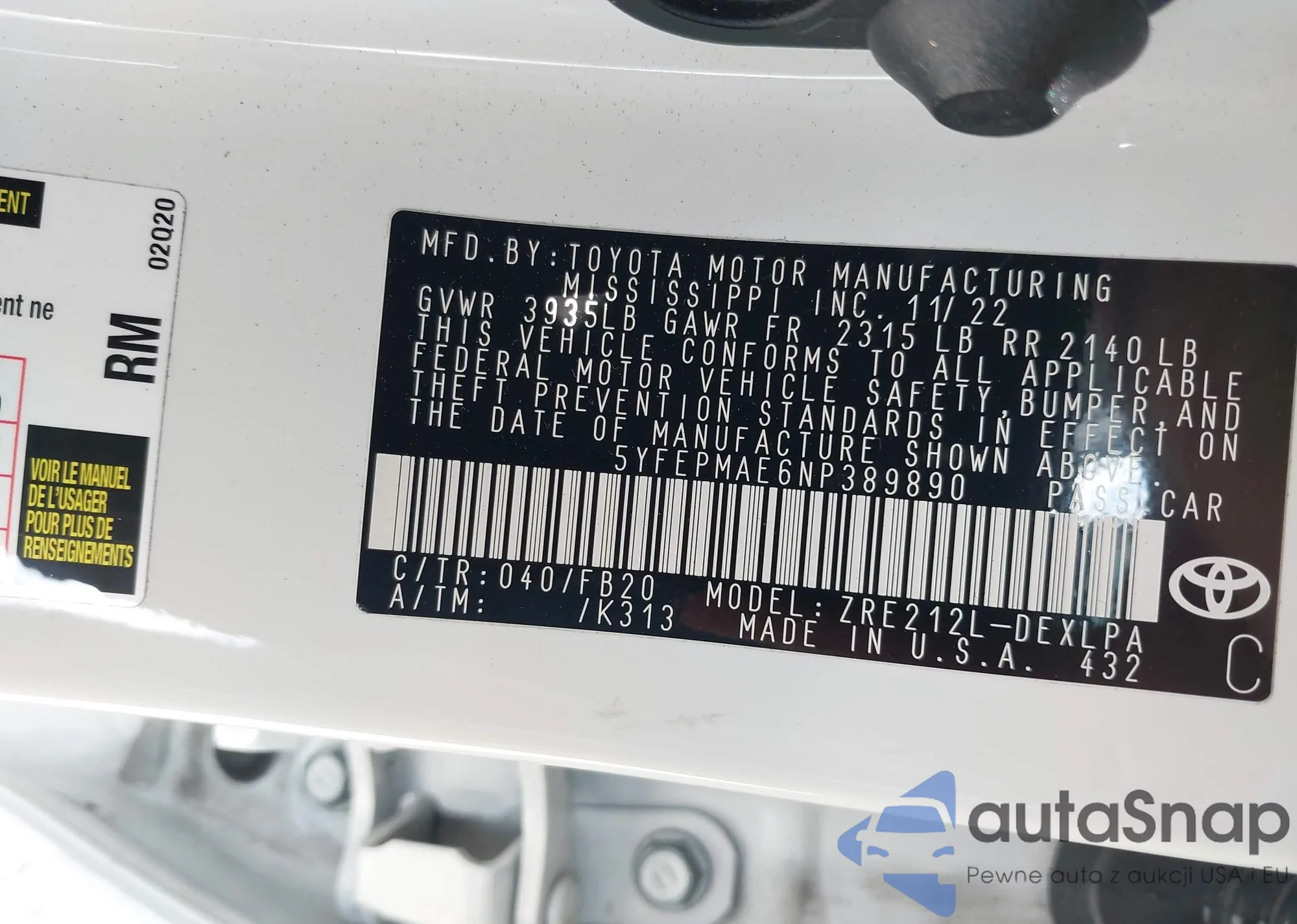 LOT: 42130709 VIN: 5YFEPMAE6NP389890