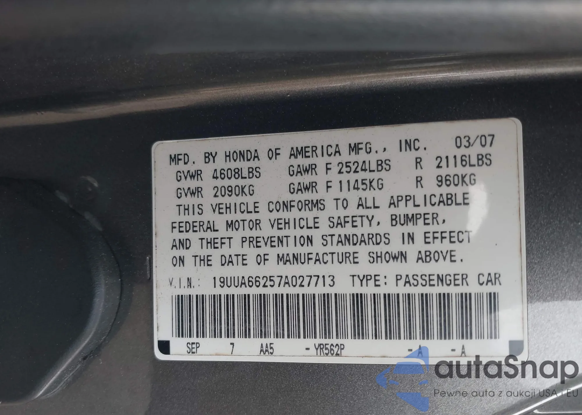 • VIN 19UUA66257A027713