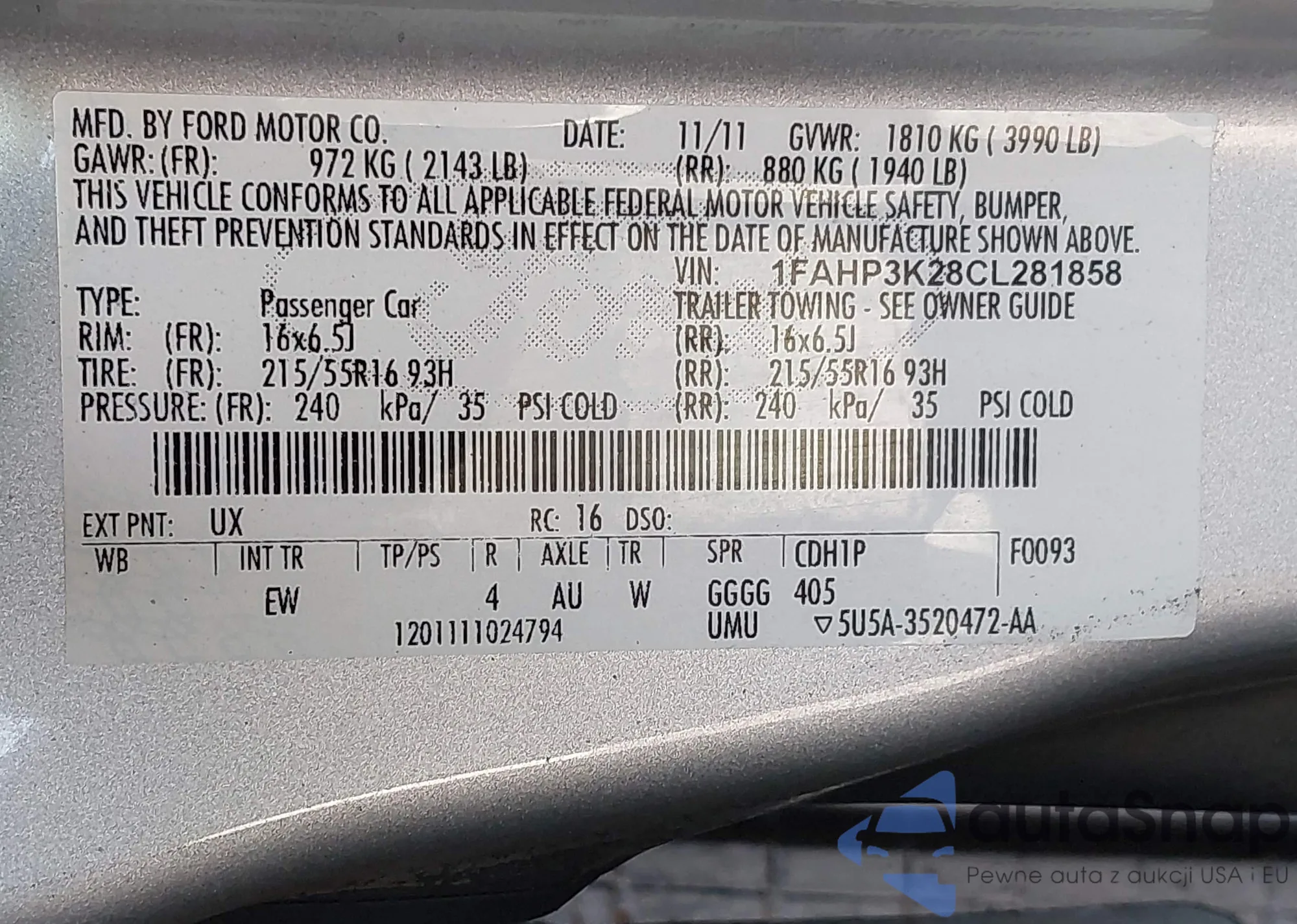 LOT: 42138243 VIN: 1FAHP3K28CL281858