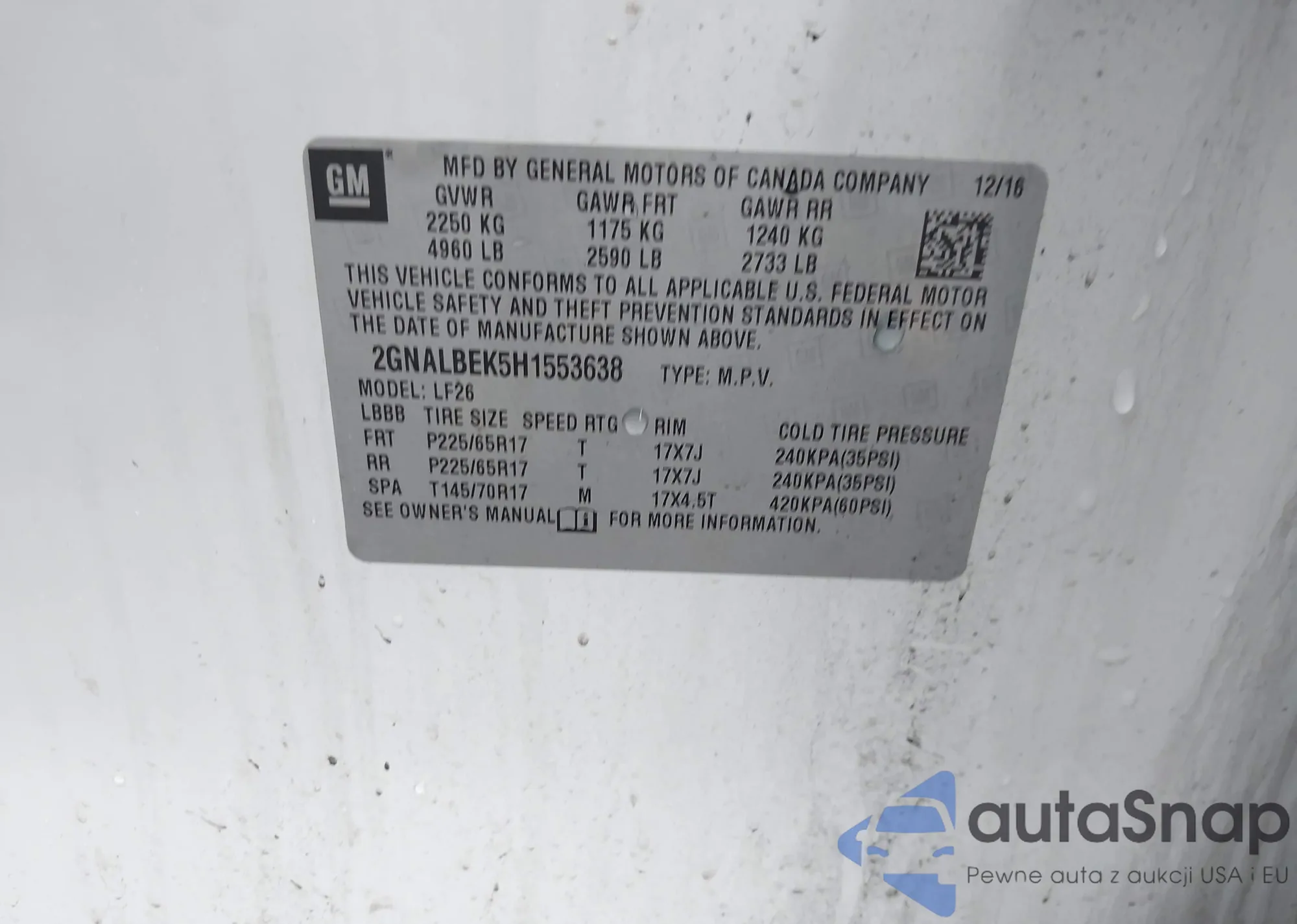 LOT: 42187217 VIN: 2GNALBEK5H1553638