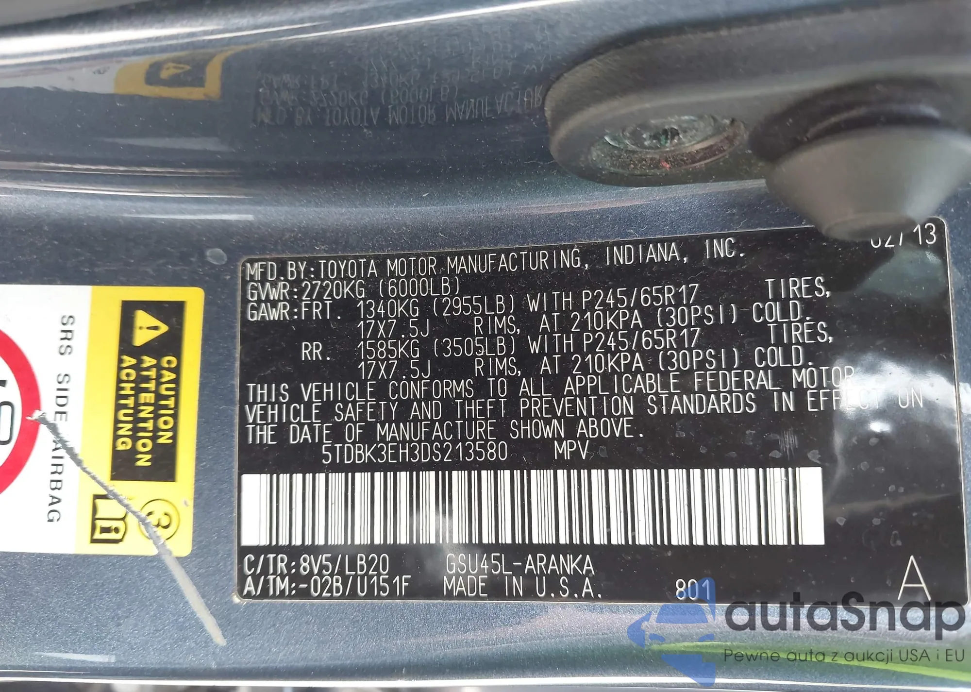 LOT: 42219914 VIN: 5TDBK3EH3DS213580
