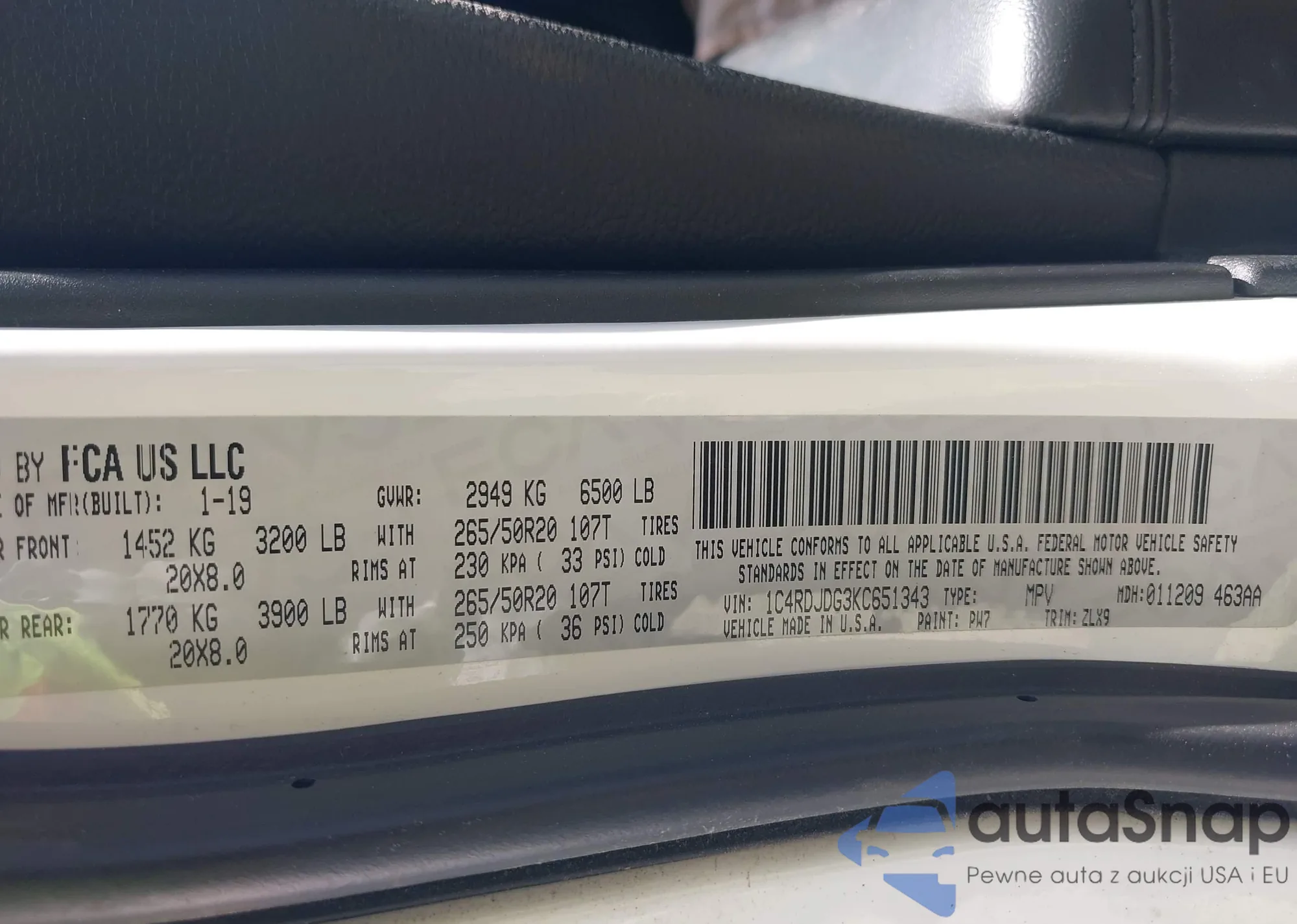 • VIN 1C4RDJDG3KC651343