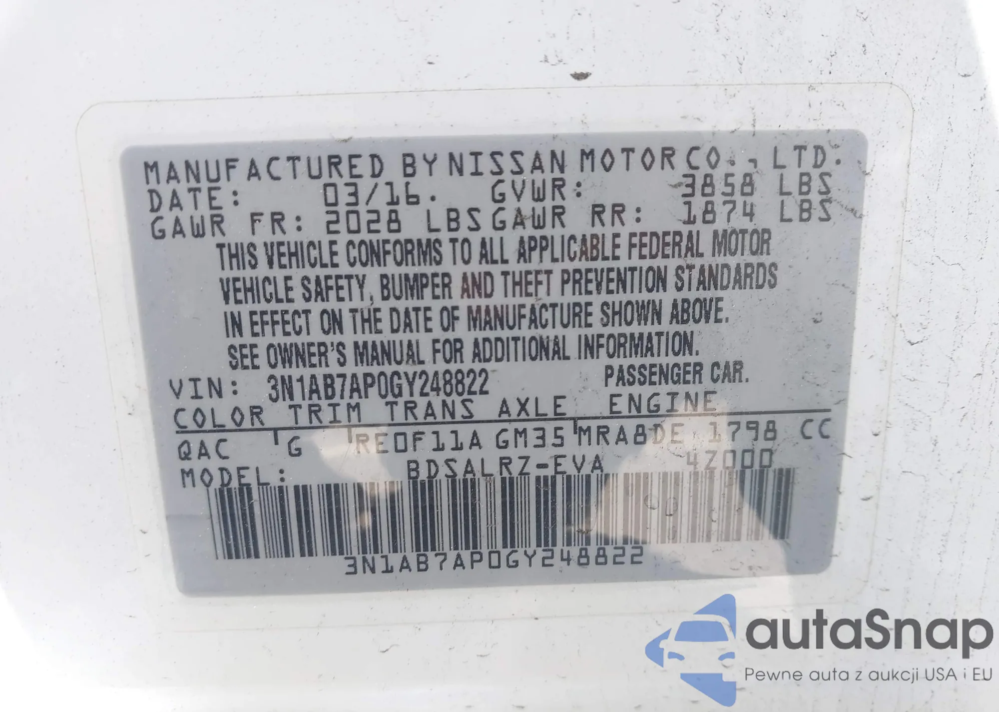 LOT: 42355635 VIN: 3N1AB7AP0GY248822