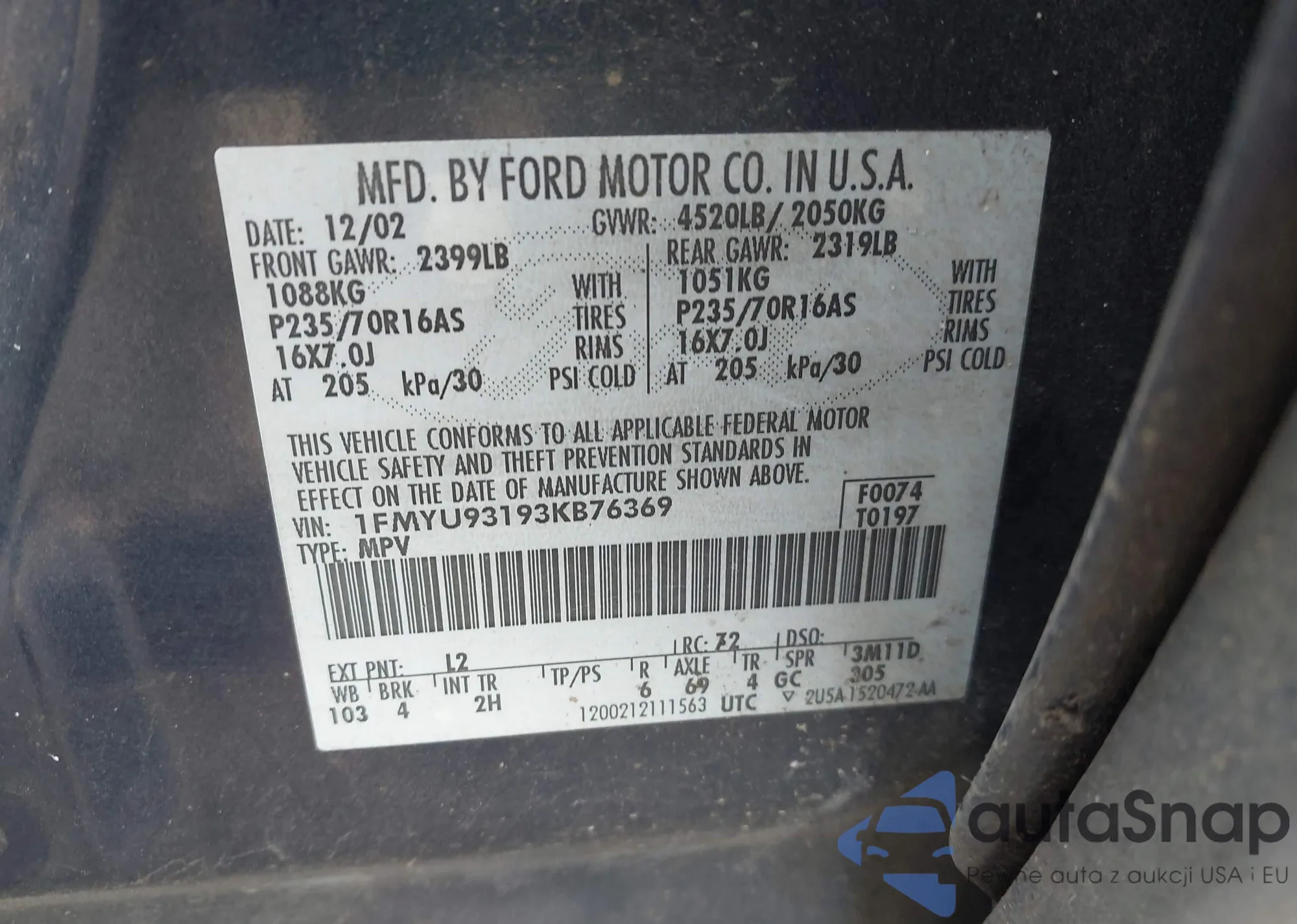 LOT: 41895790 VIN: 1FMYU93193KB76369