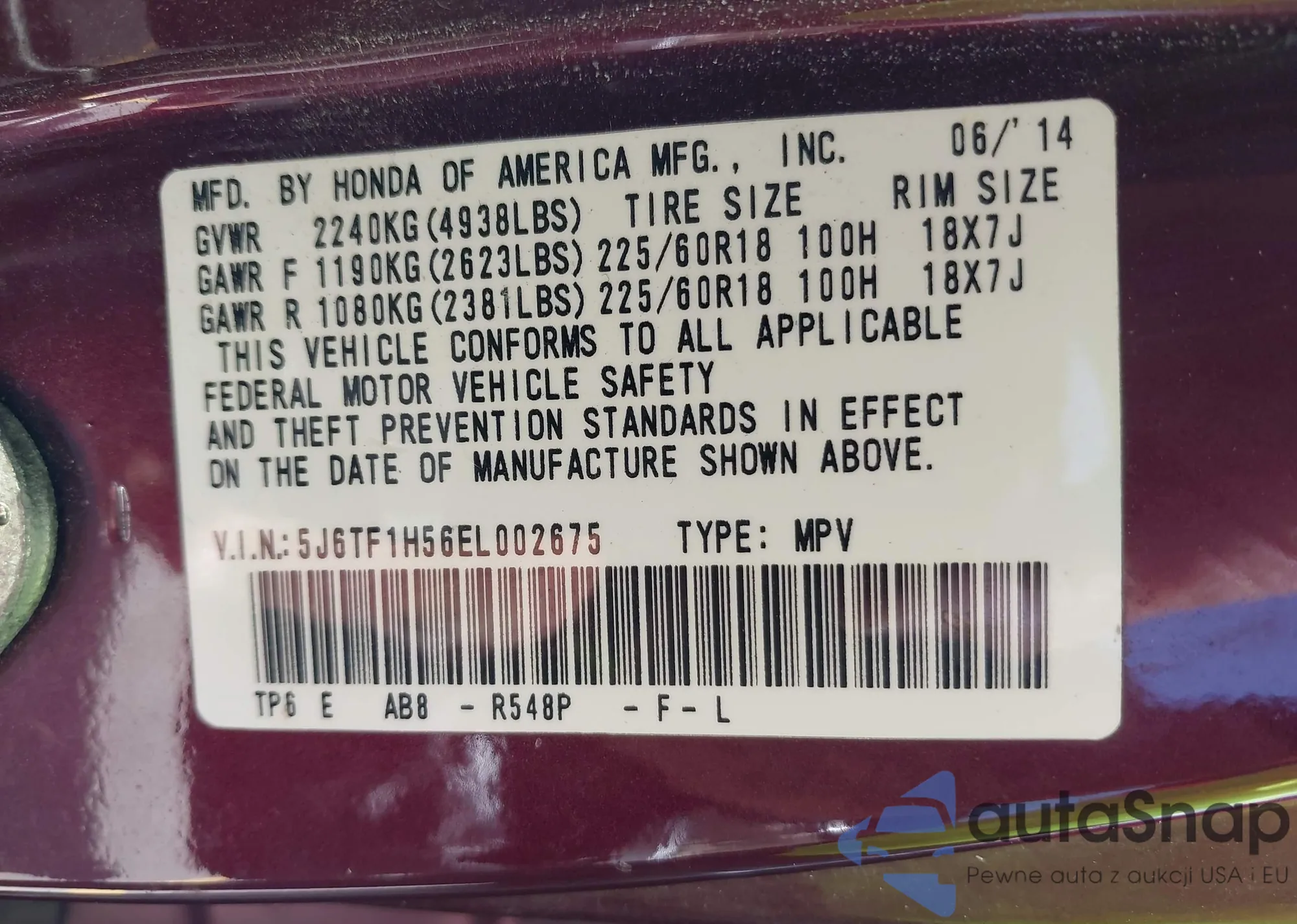 • VIN 5J6TF1H56EL002675