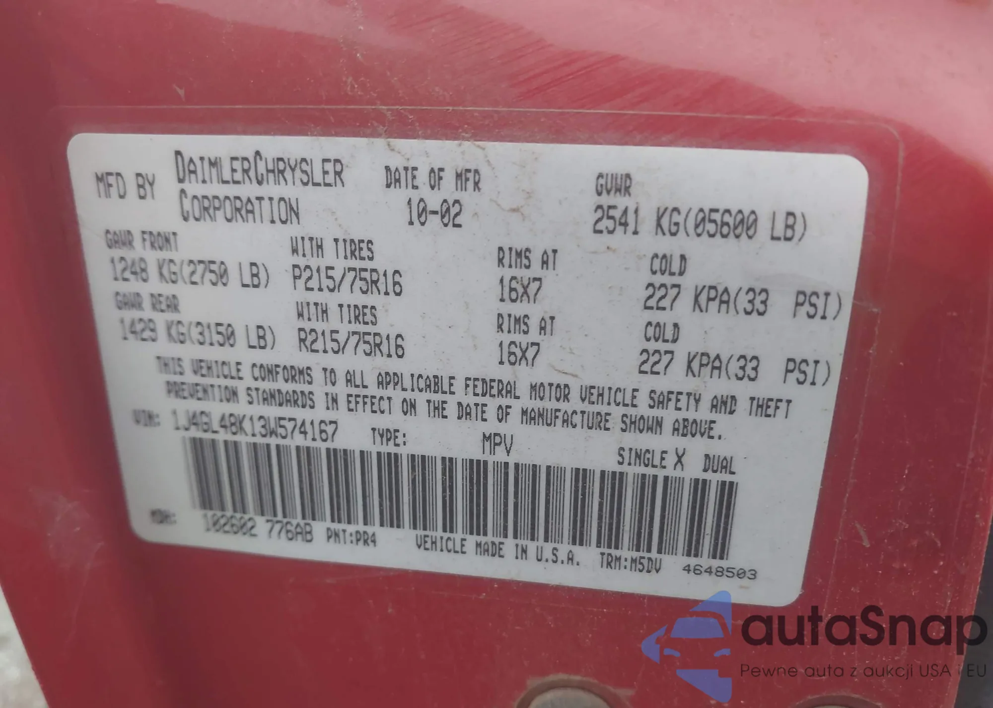 • VIN 1J4GL48K13W574167