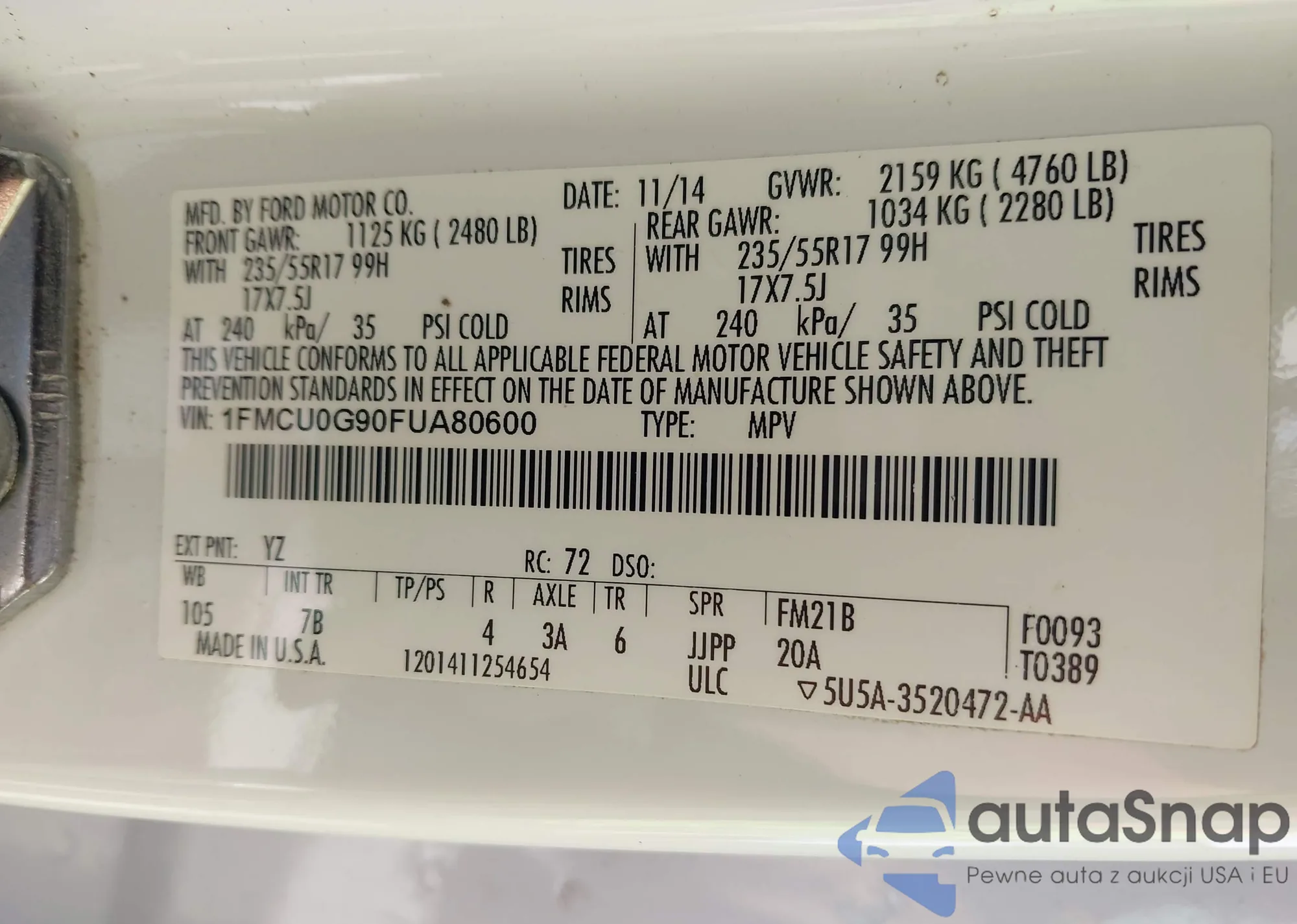 LOT: 42487865 VIN: 1FMCU0G90FUA80600
