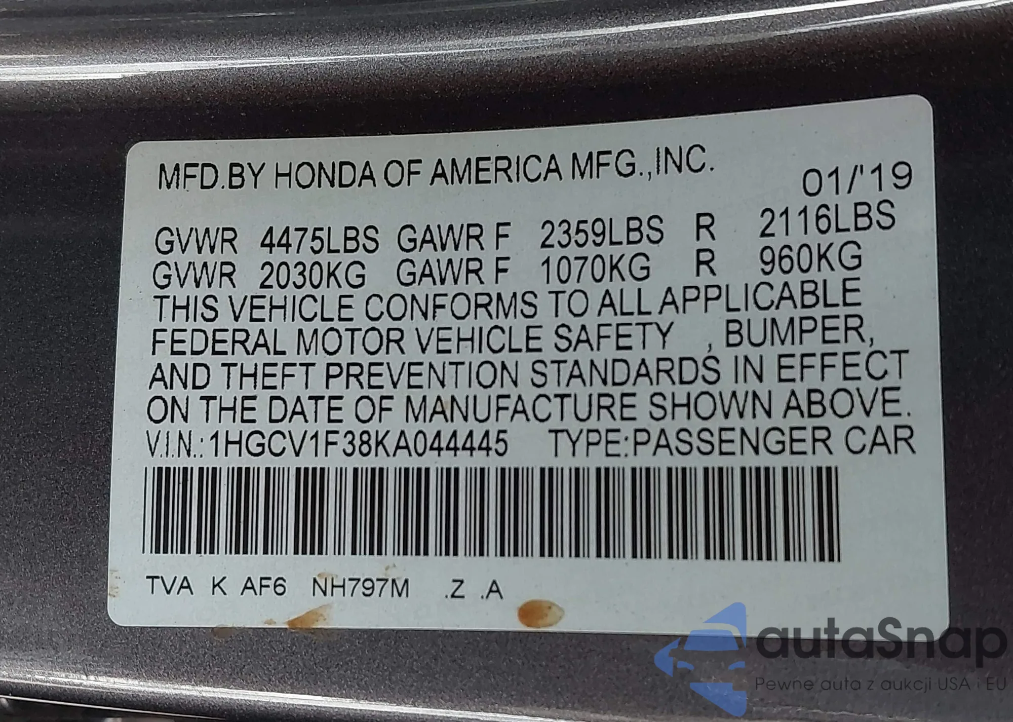 LOT: 42274593 VIN: 1HGCP26379A197909