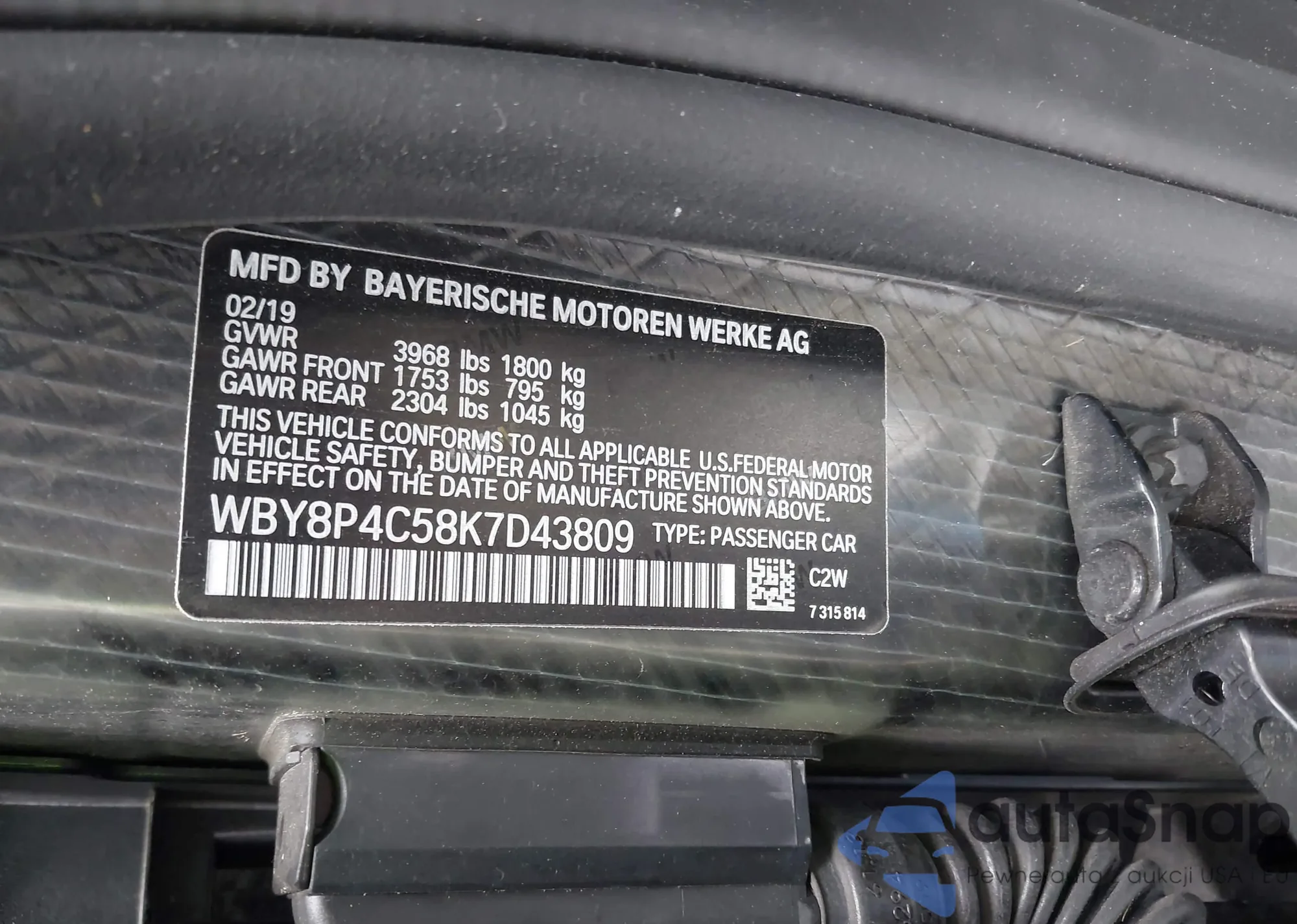 LOT: 42188630 VIN: WBY8P4C58K7D43809