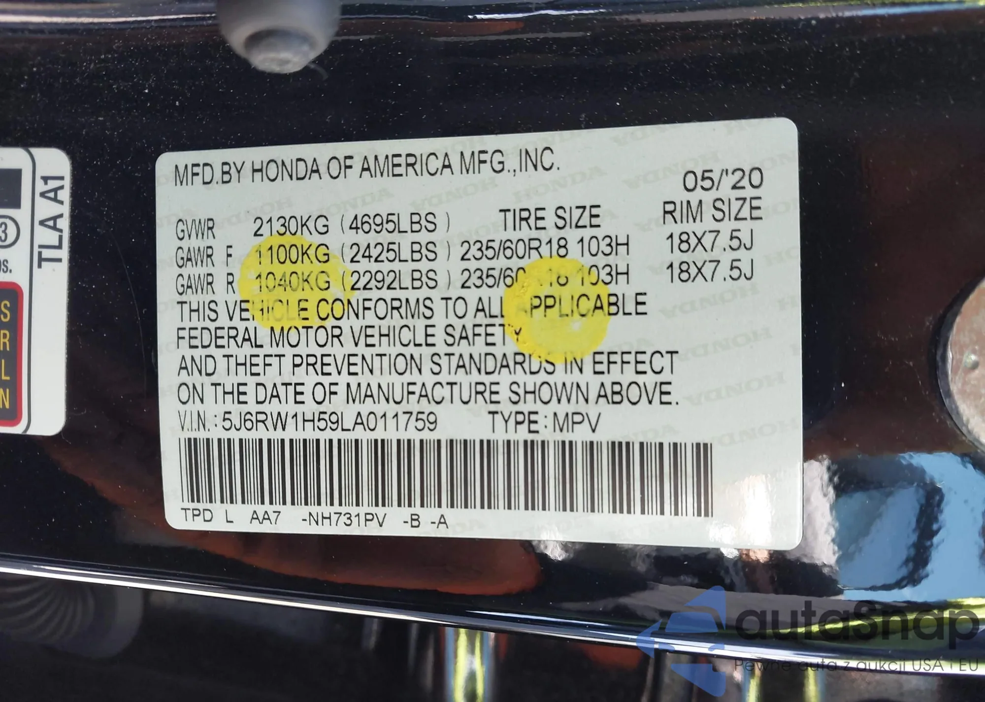 • VIN 5J6RW1H59LA011759