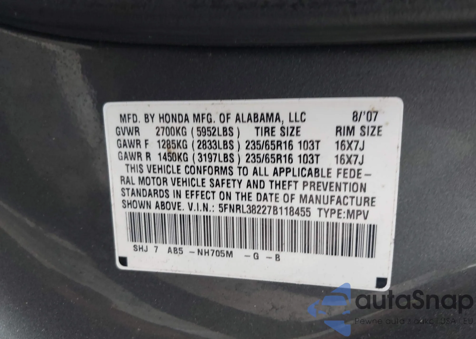 • VIN 5FNRL38227B118455