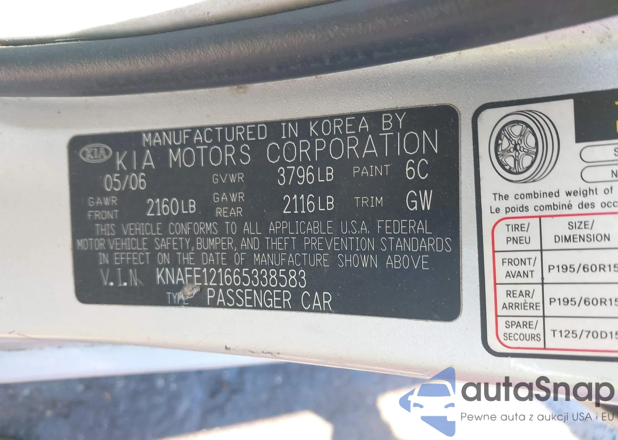 2006 Kia Spectra Ex/Lx/Sx from USA, damaged, VIN KNAFE121665338583