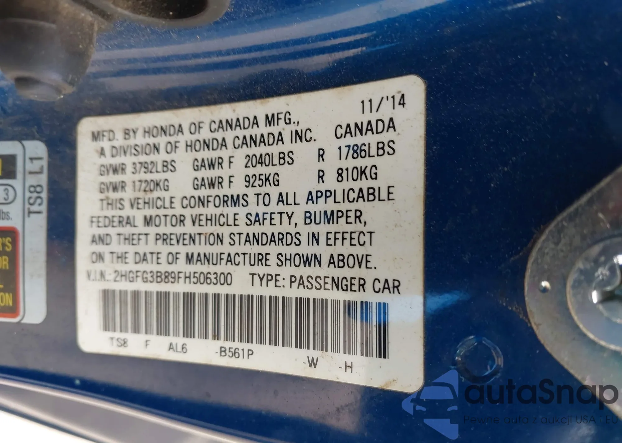LOT: 42174758 VIN: 1HGCP2F45AA192284