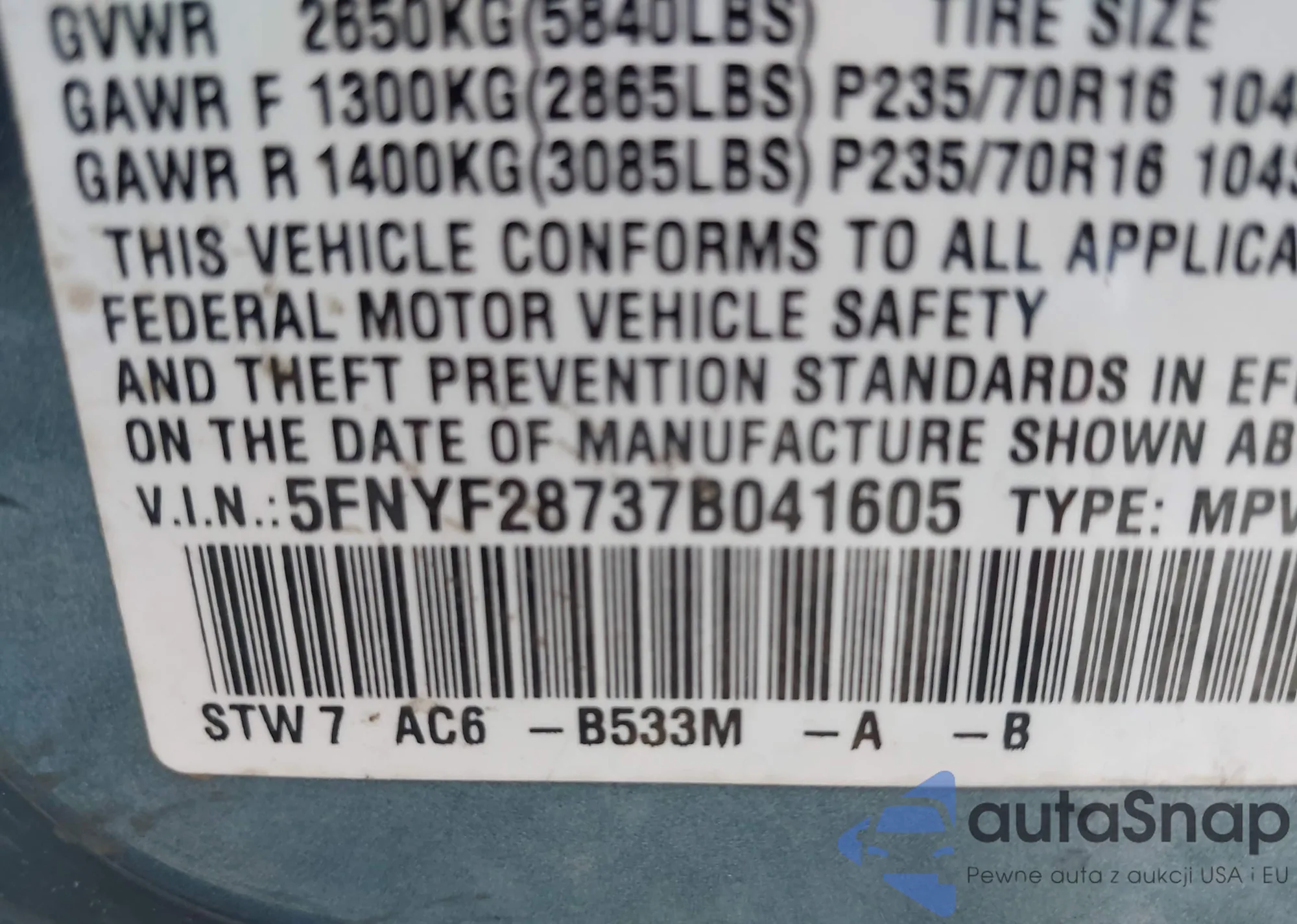 • VIN 5FNYF6H58LB049652