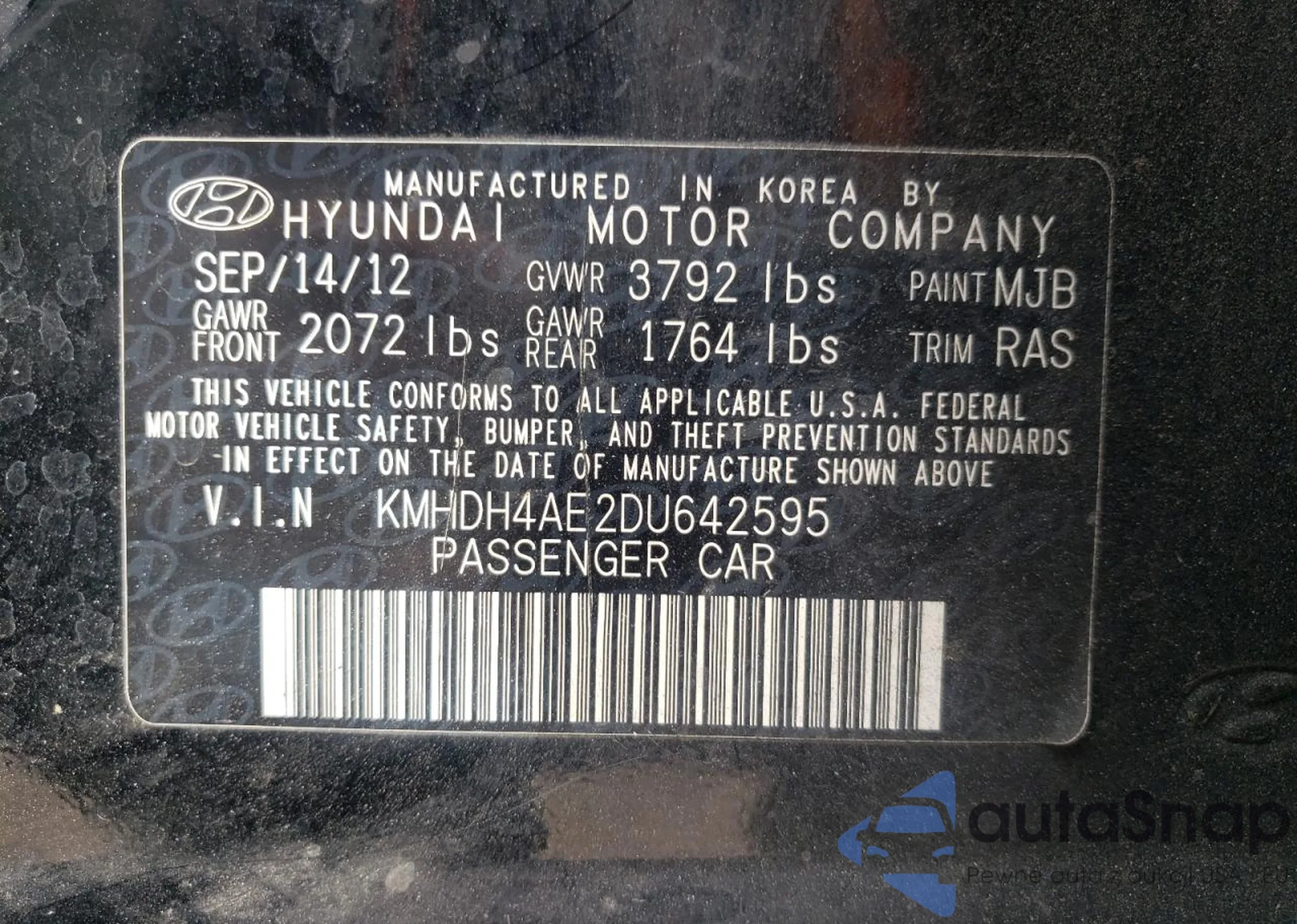 LOT: 87429834 VIN: KMHDH4AE2DU642595