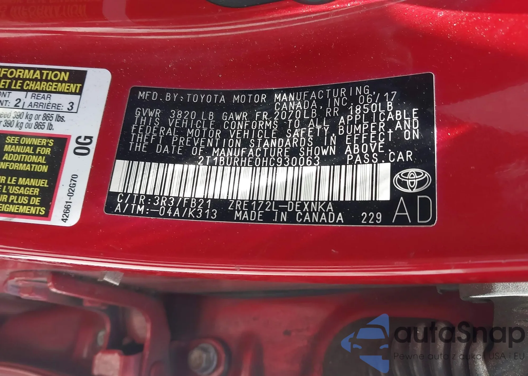 LOT: 42291318 VIN: 2T1BURHE0HC930063