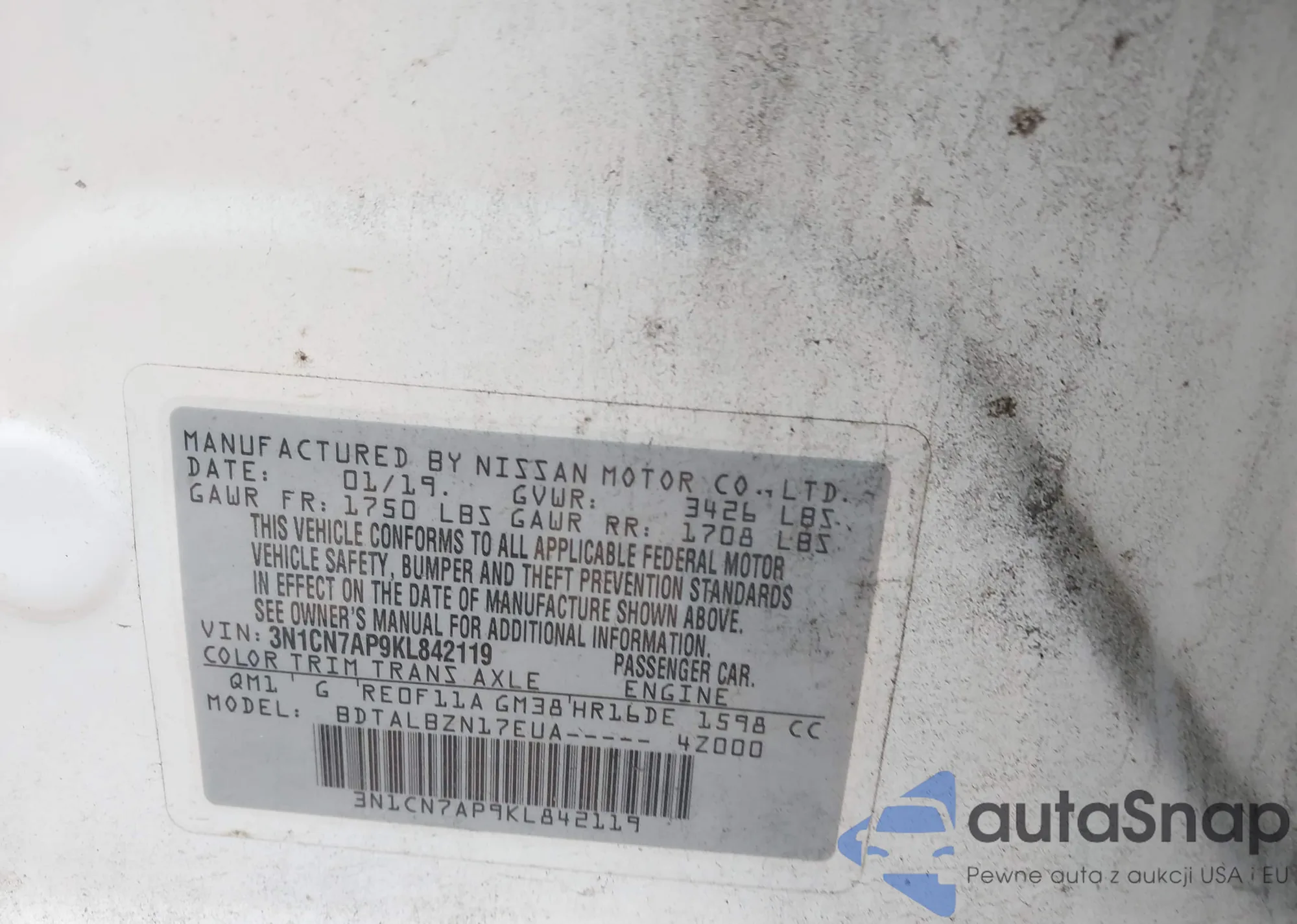 LOT: 42117192 VIN: 3N1CN7AP9KL842119