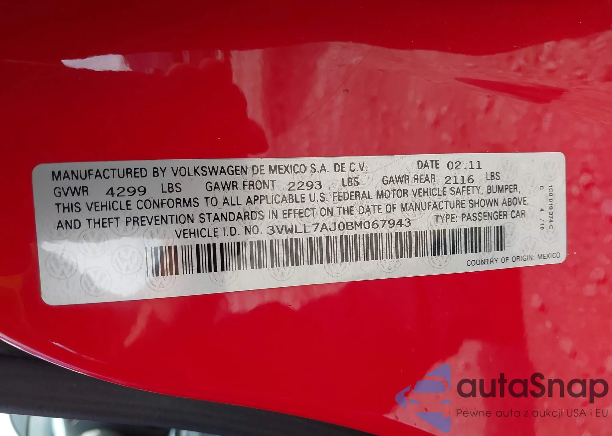 • VIN 3VWLL7AJ0BM067943
