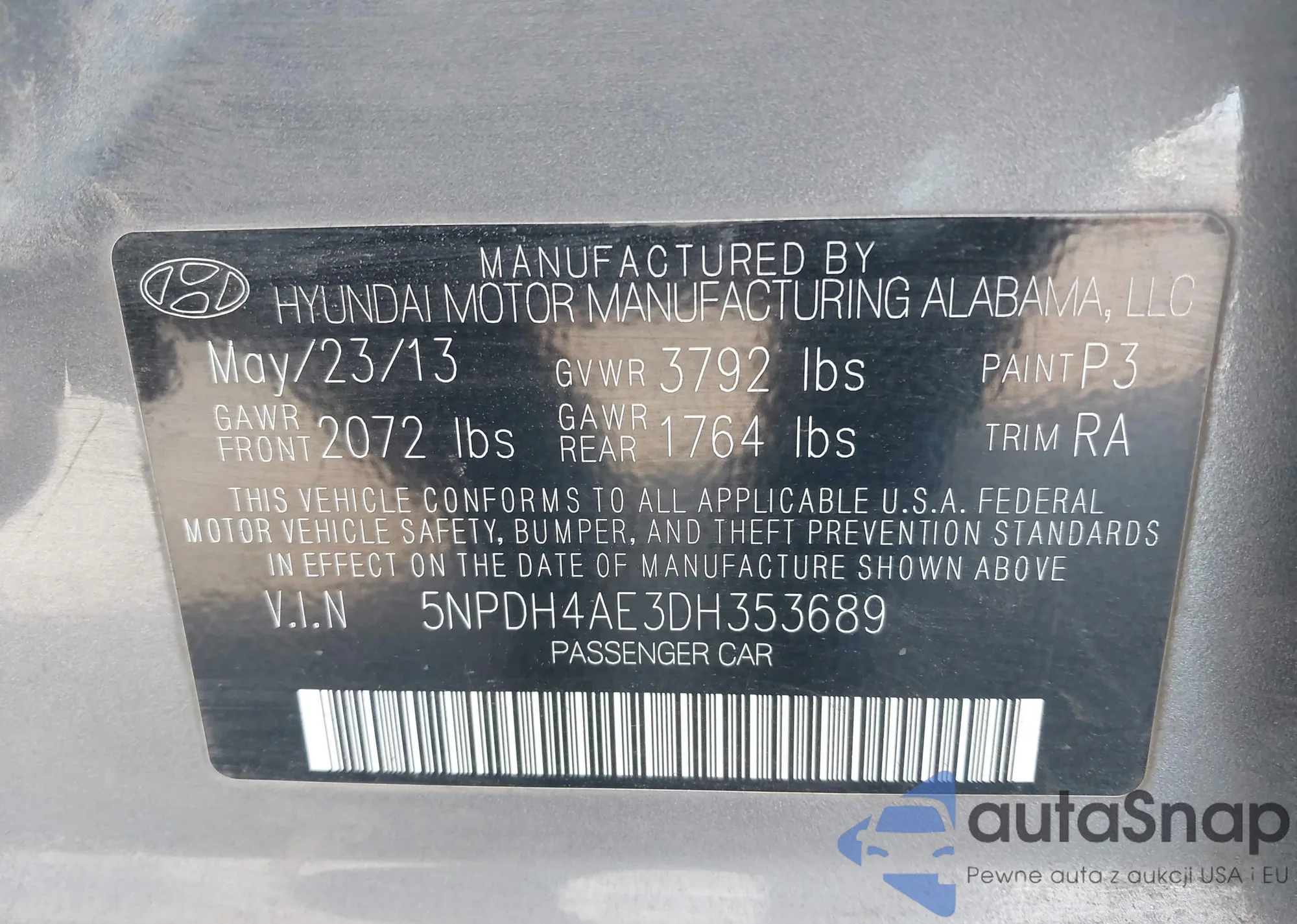 LOT: 40896235 VIN: 5NPDH4AE3DH353689