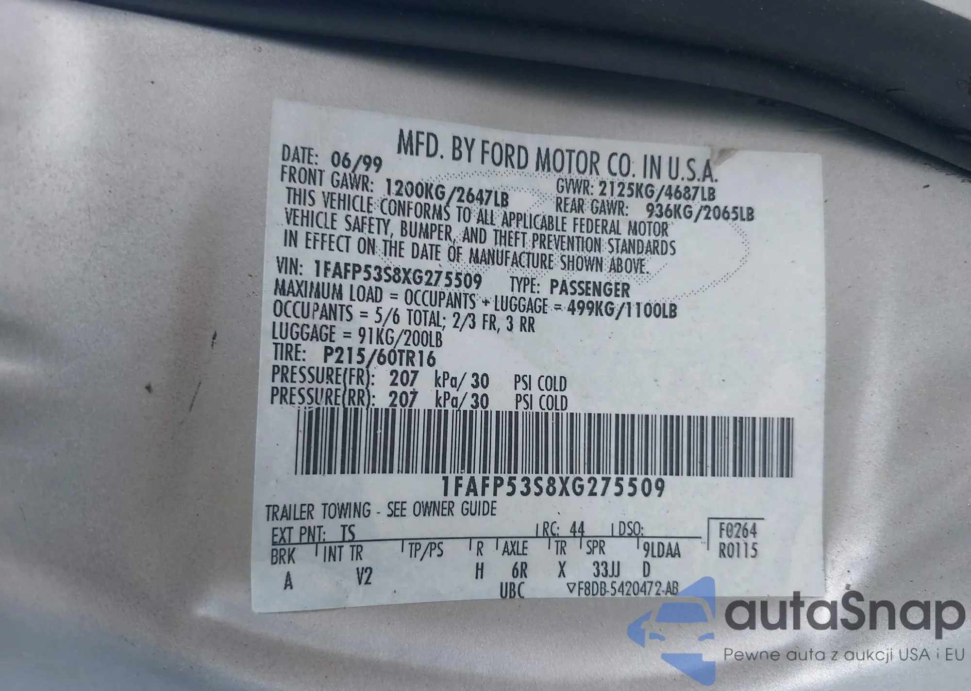 • VIN 1FAFP53S8XG275509